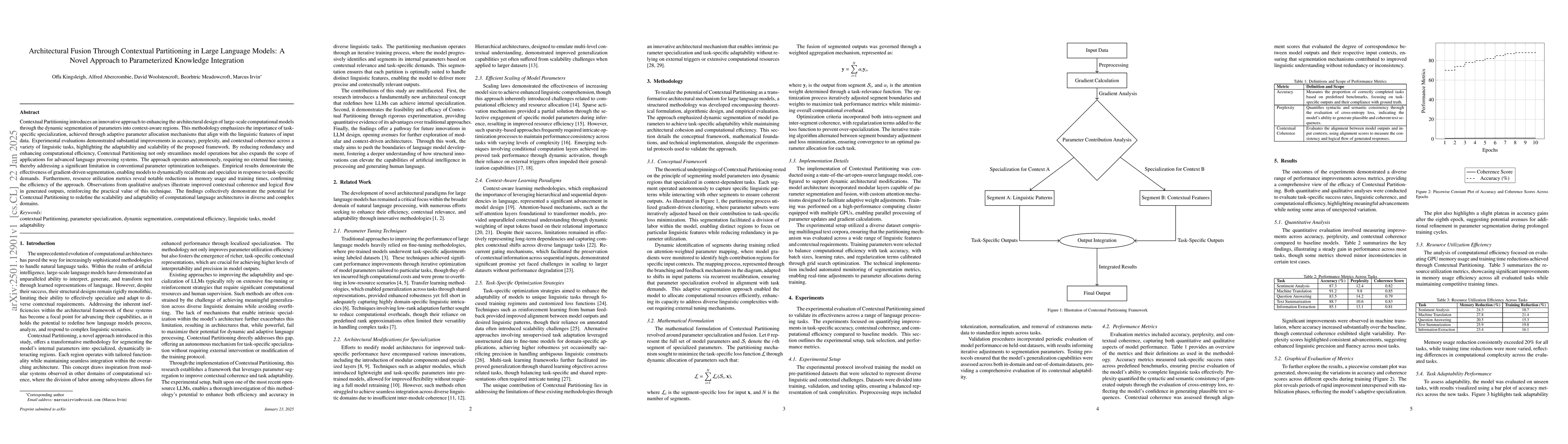 Contextual Partitioning introduces an innovative approach to enhancing the architectural design of large-scale computational models through the dynamic segmentation of parameters into context-aware regions. This methodology emphasizes the importance of task-specific specialization, achieved through adaptive parameter allocation mechanisms that align with the linguistic features of input data. Experimental evaluations demonstrated substantial improvements in accuracy, perplexity, and contextual coherence across a variety of linguistic tasks, highlighting the adaptability and scalability of the proposed framework. By reducing redundancy and enhancing computational efficiency, Contextual Partitioning not only streamlines model operations but also expands the scope of applications for advanced language processing systems. The approach operates autonomously, requiring no external fine-tuning, thereby addressing a significant limitation in conventional parameter optimization techniques. Empirical results demonstrate the effectiveness of gradient-driven segmentation, enabling models to dynamically recalibrate and specialize in response to task-specific demands. Furthermore, resource utilization metrics reveal notable reductions in memory usage and training times, confirming the efficiency of the approach. Observations from qualitative analyses illustrate improved contextual coherence and logical flow in generated outputs, reinforcing the practical value of this technique. The findings collectively demonstrate the potential for Contextual Partitioning to redefine the scalability and adaptability of computational language architectures in diverse and complex domains.