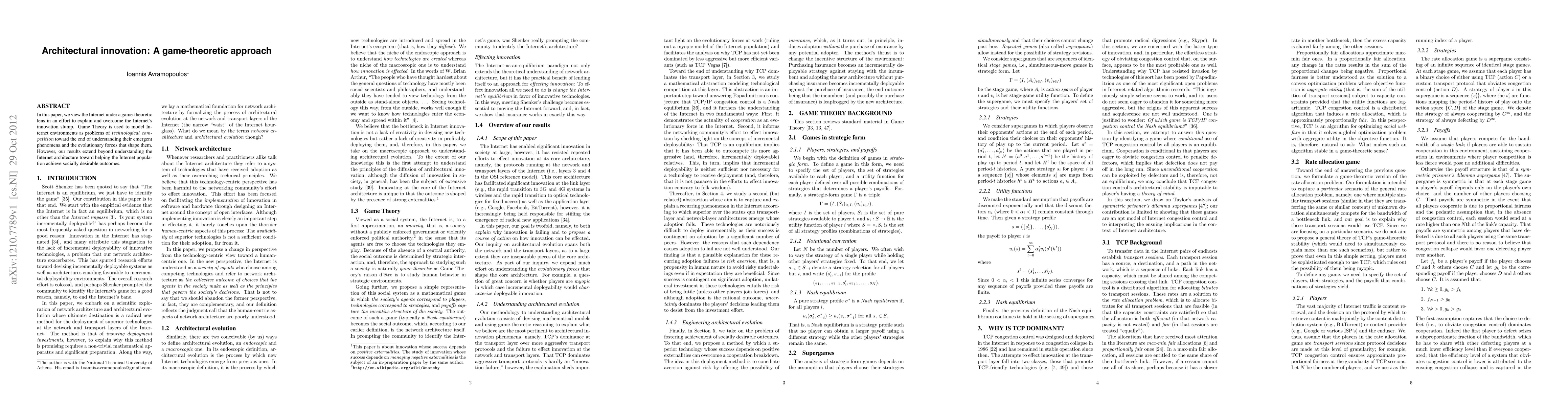 In this paper, we view the Internet under a game-theoretic lens in an effort to explain and overcome the Internet's innovation slump. Game Theory is used to model Internet environments as problems of technological competition toward the end of understanding their emergent phenomena and the evolutionary forces that shape them. However, our results extend beyond understanding the Internet architecture toward helping the Internet population achieve socially desirable outcomes.