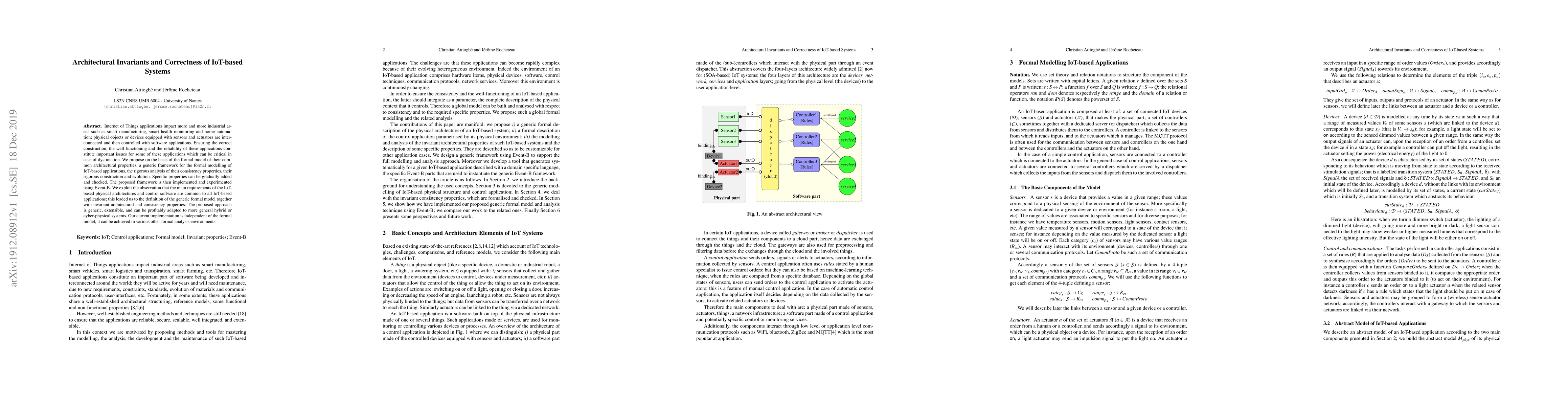 This paper proposes a framework for the formal modeling and analysis of IoT-based systems based on shared architectural invariants, ensuring correctness and reliability. The approach is implemented using Event-B and is adaptable to broader hybrid or cyber-physical systems.