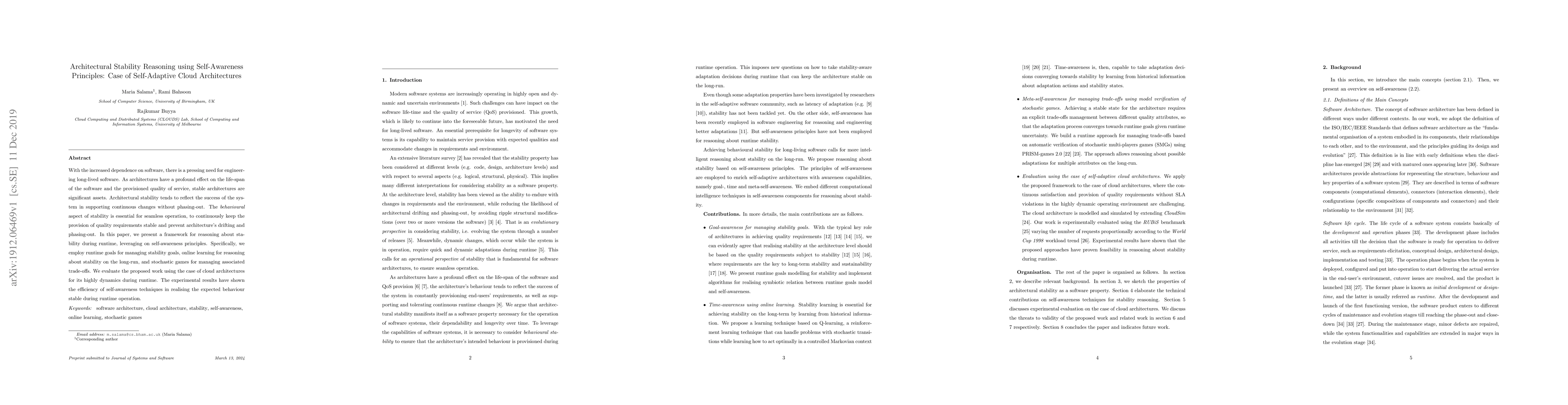 This paper proposes a framework using self-awareness principles to reason about architectural stability in self-adaptive cloud architectures, leveraging runtime goals, online learning, and stochastic games to manage stability and trade-offs. Experimental results demonstrate the effectiveness of these techniques in maintaining stable behavior during dynamic runtime conditions.