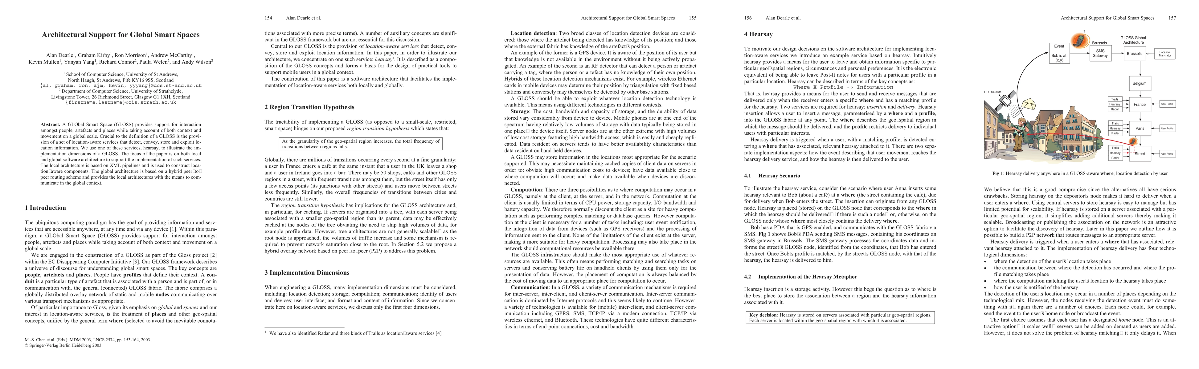 A GLObal Smart Space (GLOSS) provides support for interaction amongst people, artefacts and places while taking account of both context and movement on a global scale. Crucial to the definition of a GLOSS is the provision of a set of location-aware services that detect, convey, store and exploit location information. We use one of these services, hearsay, to illustrate the implementation dimensions of a GLOSS. The focus of the paper is on both local and global software architecture to support the implementation of such services. The local architecture is based on XML pipe-lines and is used to construct location-aware components. The global architecture is based on a hybrid peer-to-peer routing scheme and provides the local architectures with the means to communicate in the global context.