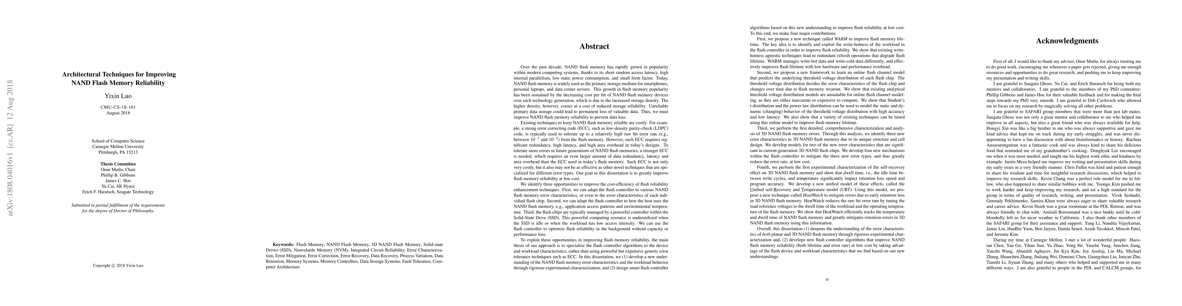 This paper explores low-cost architectural techniques to enhance NAND flash memory reliability, demonstrating significant improvements through methods like WARM, an online flash channel model framework, and HeatWatch. These techniques aim to manage errors and retention issues, particularly in 3D NAND, with minimal performance overhead.