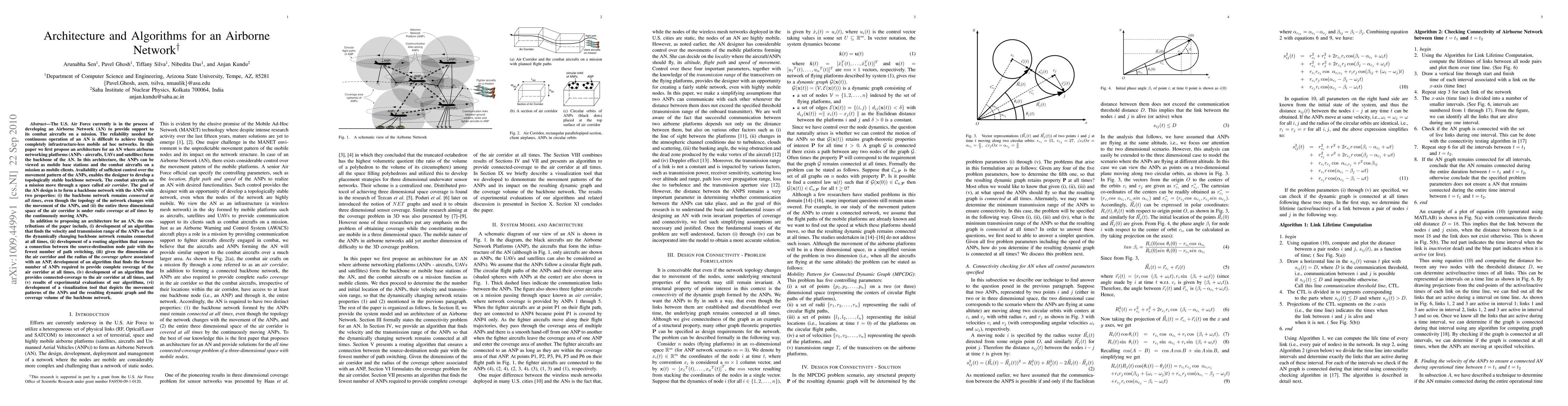 The U.S. Air Force currently is in the process of developing an Airborne Network (AN) to provide support to its combat aircrafts on a mission. The reliability needed for continuous operation of an AN is difficult to achieve through completely infrastructure-less mobile ad hoc networks. In this paper we first propose an architecture for an AN where airborne networking platforms (ANPs - aircrafts, UAVs and satellites) form the backbone of the AN. In this architecture, the ANPs can be viewed as mobile base stations and the combat aircrafts on a mission as mobile clients. The combat aircrafts on a mission move through a space called air corridor. The goal of the AN design is to form a backbone network with the ANPs with two properties: (i) the backbone network remains connected at all times, even though the topology of the network changes with the movement of the ANPs, and (ii) the entire 3D space of the air corridor is under radio coverage at all times by the continuously moving ANPs. In addition to proposing an architecture for an AN, the contributions of the paper include, development of an algorithm that finds the velocity and transmission range of the ANPs so that the dynamically changing backbone network remains connected at all times, development of a routing algorithm that ensures a connection between the source-destination node pair with the fewest number of path switching, given the dimensions of the air corridor and the radius of the coverage sphere associated with an ANP, development of an algorithm that finds the fewest number of ANPs required to provide complete coverage of the air corridor at all times, development of an algorithm that provides connected-coverage to the air corridor at all times, and development of a visualization tool that depicts the movement patterns of the ANPs and the resulting dynamic graph and the coverage volume of the backbone network.