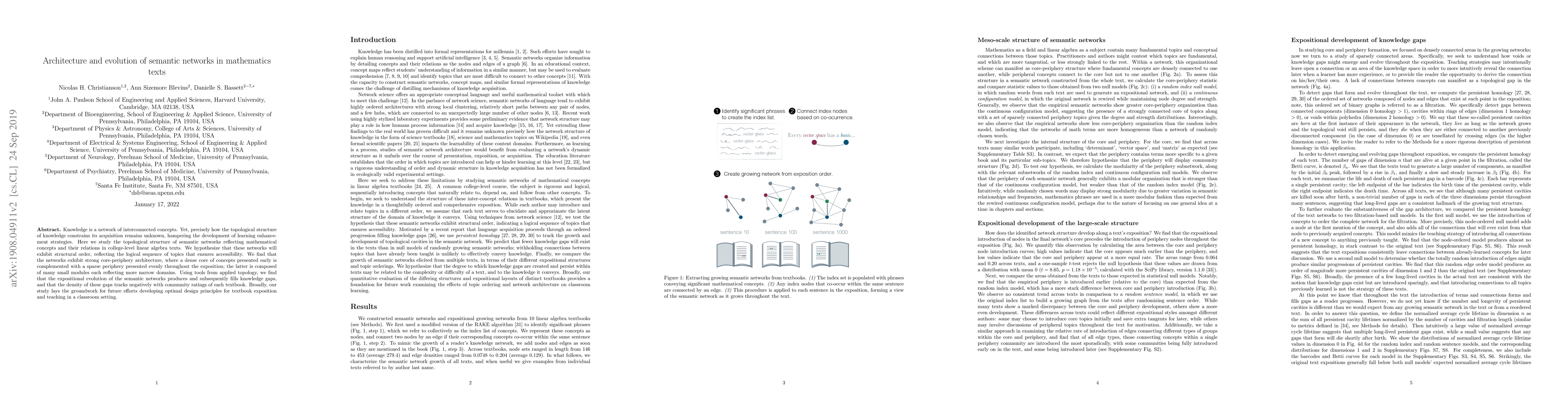 Knowledge is a network of interconnected concepts. Yet, precisely how the topological structure of knowledge constrains its acquisition remains unknown, hampering the development of learning enhancement strategies. Here we study the topological structure of semantic networks reflecting mathematical concepts and their relations in college-level linear algebra texts. We hypothesize that these networks will exhibit structural order, reflecting the logical sequence of topics that ensures accessibility. We find that the networks exhibit strong core-periphery architecture, where a dense core of concepts presented early is complemented with a sparse periphery presented evenly throughout the exposition; the latter is composed of many small modules each reflecting more narrow domains. Using tools from applied topology, we find that the expositional evolution of the semantic networks produces and subsequently fills knowledge gaps, and that the density of these gaps tracks negatively with community ratings of each textbook. Broadly, our study lays the groundwork for future efforts developing optimal design principles for textbook exposition and teaching in a classroom setting.