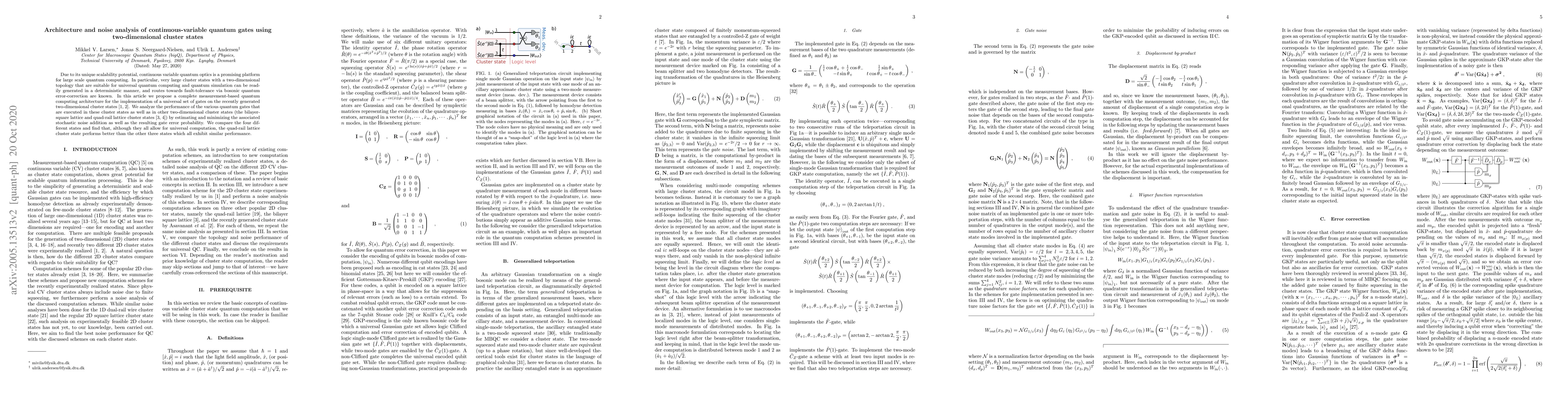 This paper proposes a measurement-based quantum computing architecture for implementing universal quantum gates using two-dimensional cluster states, analyzing noise and gate error probabilities. The quad-rail lattice cluster state is found to outperform other topologies in terms of lower noise and error rates.