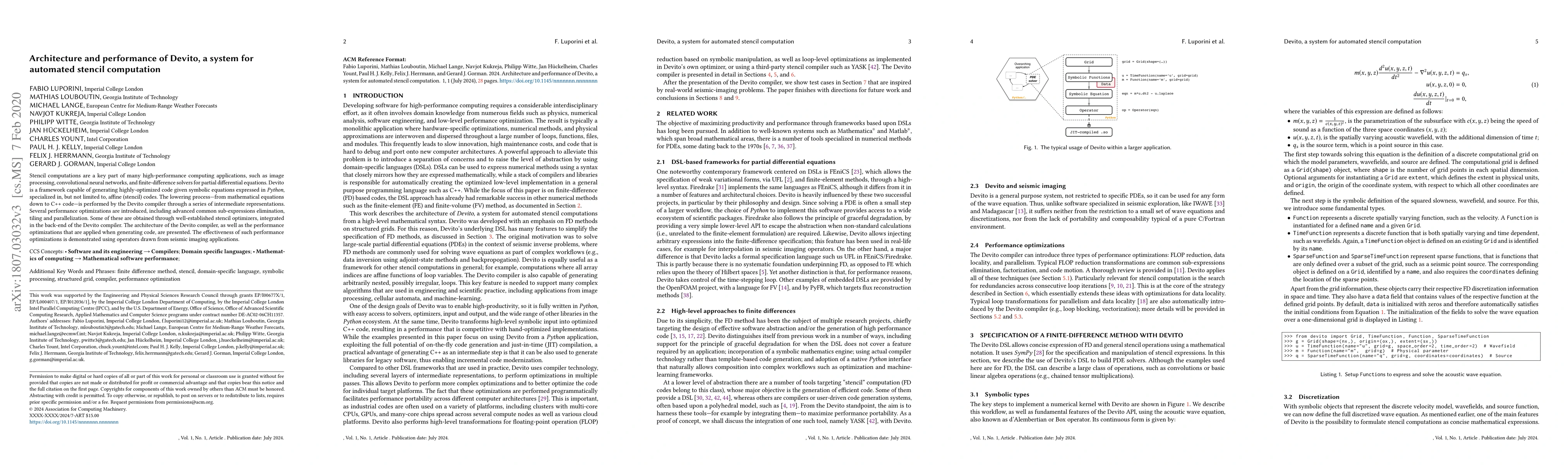 Devito is a framework for automated stencil computation, generating optimized C++ code from Python symbolic equations. It employs advanced optimizations like common sub-expression elimination and parallelization to improve performance, demonstrated effectively in seismic imaging applications.