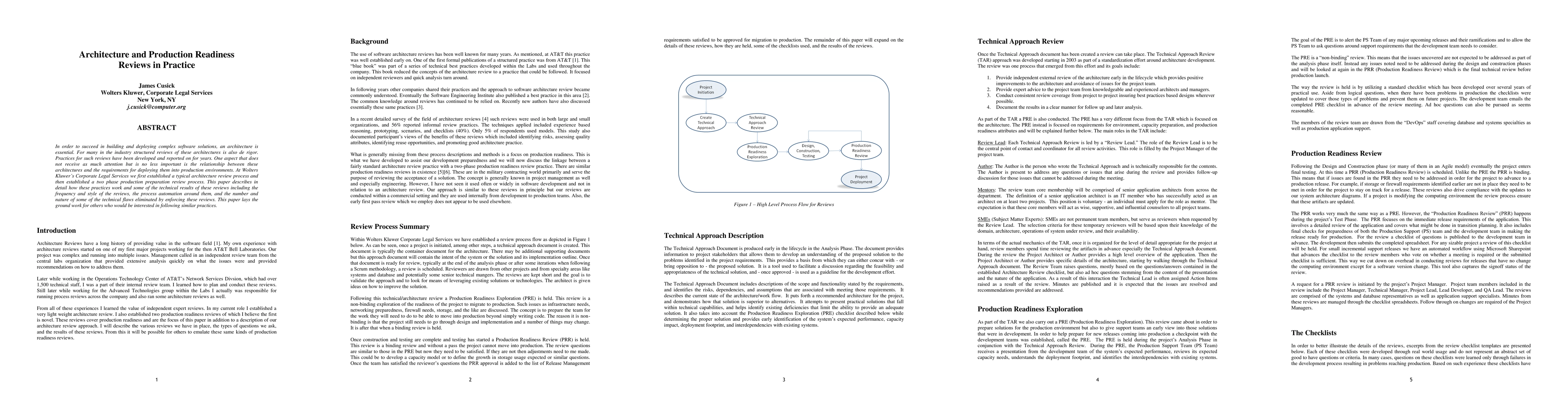 This paper details Wolters Kluwer's Corporate Legal Services' architecture review practices, focusing on production environment preparation. It outlines a two-phase review process, automation techniques, and technical improvements achieved, serving as a guide for similar implementation in other organizations.