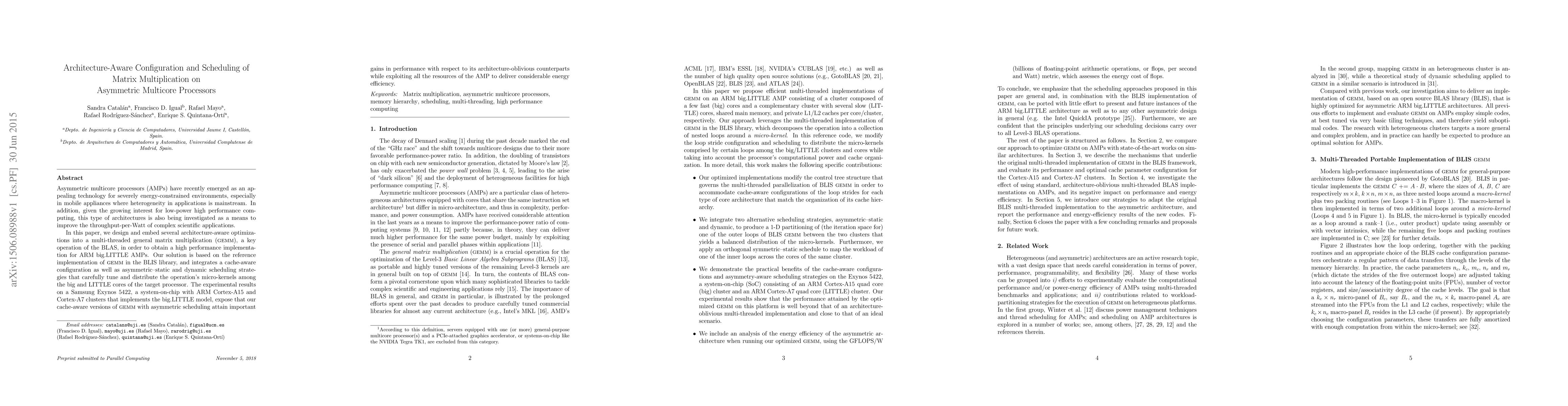 This paper presents architecture-aware optimizations for multi-threaded general matrix multiplication on asymmetric multicore processors (AMPs), achieving high performance and energy efficiency. The proposed solution integrates cache-aware configurations and asymmetric scheduling strategies, demonstrating significant performance gains and energy efficiency on a Samsung Exynos 5422 processor.