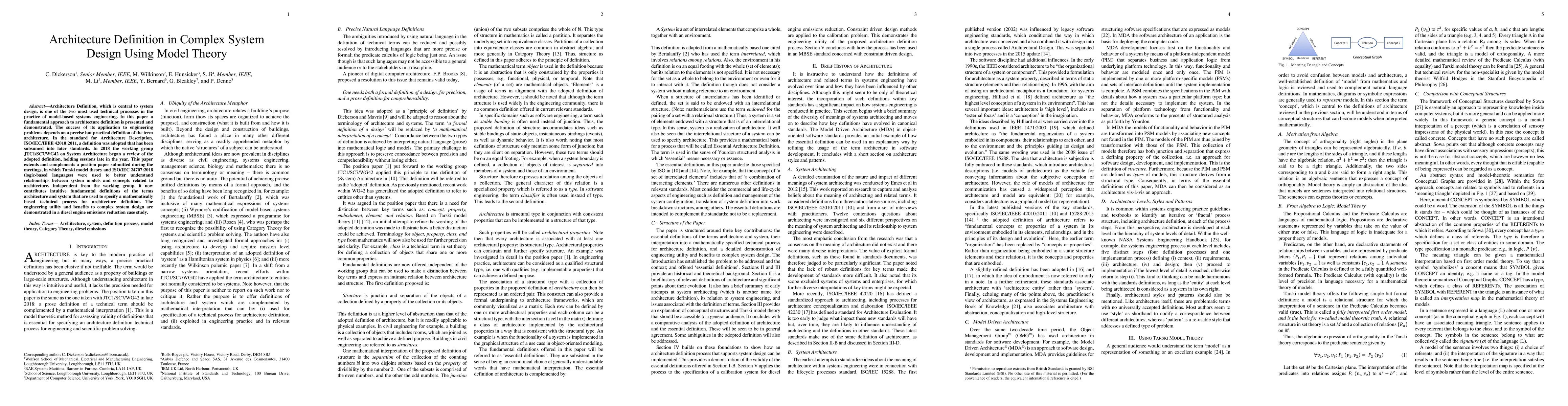 This paper introduces a new, mathematically-based process for defining system architecture using model theory, complementing the ISO/IEC/IEEE 42010:2011 standard. The approach is demonstrated with a diesel engine emissions reduction case study, showcasing its engineering utility in complex system design.
