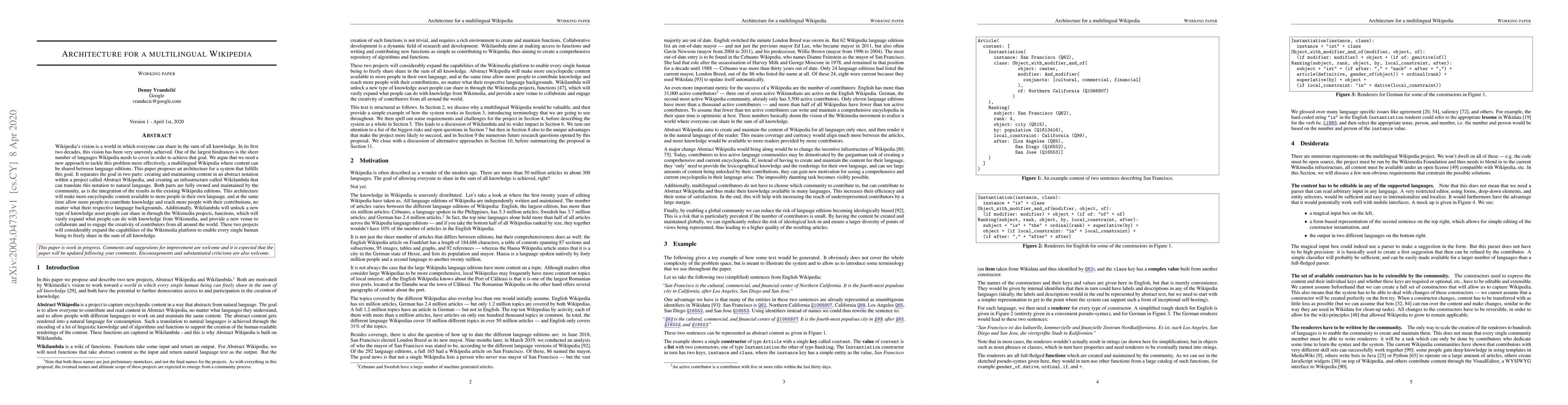 This paper proposes an architecture for a multilingual Wikipedia that aims to make content more accessible in various languages by using Abstract Wikipedia for content creation and Wikilambda for translation. This approach seeks to enhance global knowledge sharing and contributor engagement across language barriers.