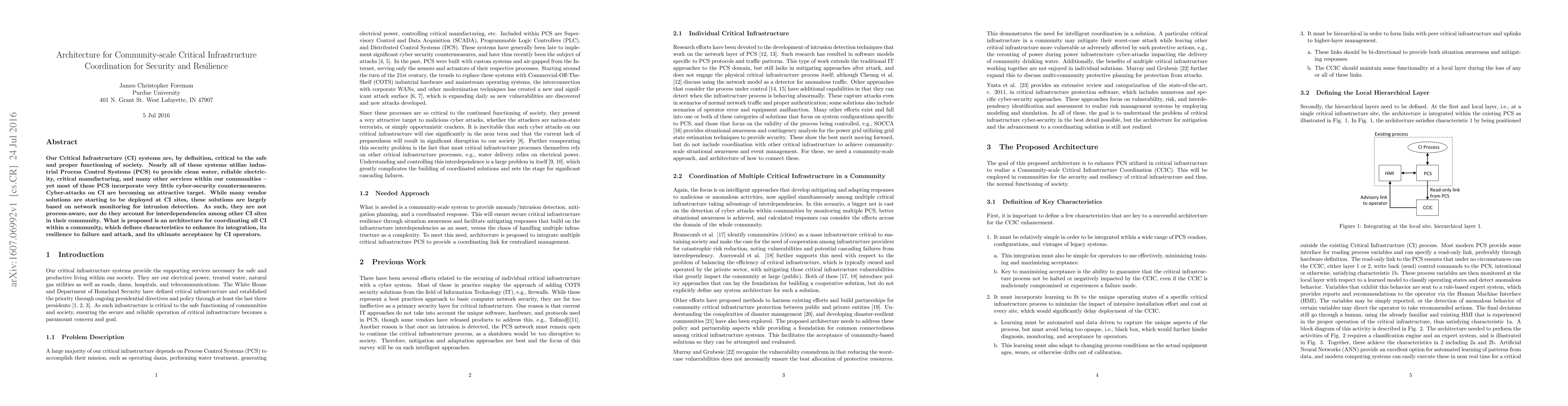 Our Critical Infrastructure (CI) systems are, by definition, critical to the safe and proper functioning of society. Nearly all of these systems utilize industrial Process Control Systems (PCS) to provide clean water, reliable electricity, critical manufacturing, and many other services within our communities - yet most of these PCS incorporate very little cyber-security countermeasures. Cyber-attacks on CI are becoming an attractive target. While many vendor solutions are starting to be deployed at CI sites, these solutions are largely based on network monitoring for intrusion detection. As such, they are not process-aware, nor do they account for inter dependencies among other CI sites in their community. What is proposed is an architecture for coordinating all CI within a community, which defines characteristics to enhance its integration, its resilience to failure and attack, and its ultimate acceptance by CI operators.
