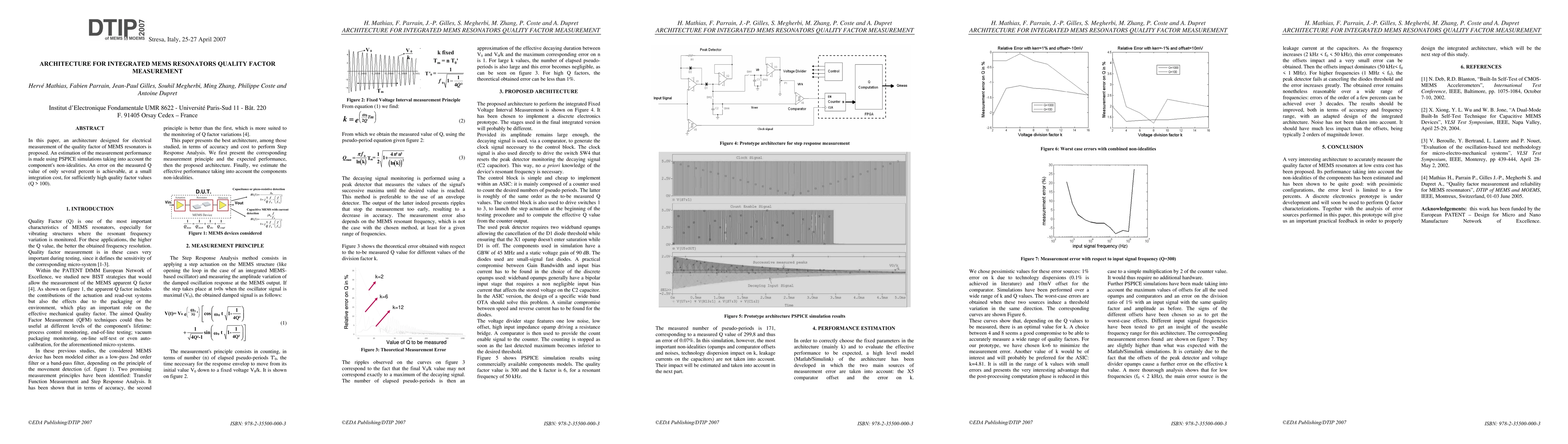 This paper proposes an architecture for accurately measuring the quality factor of MEMS resonators, achieving an error of only several percent through PSPICE simulations, with minimal integration cost for resonators with high quality factors (Q > 100).