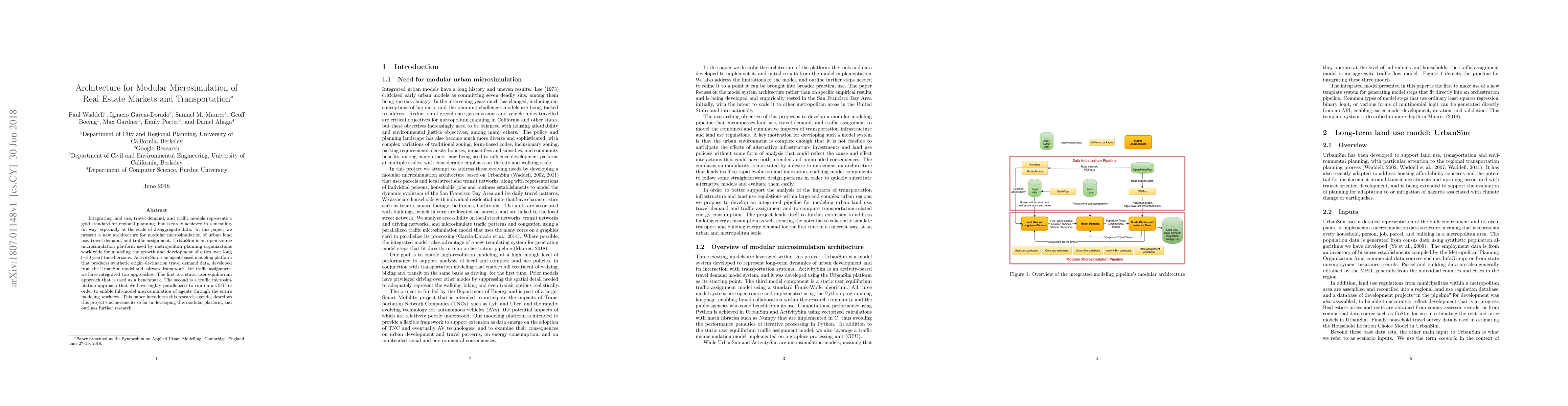 This paper introduces a new modular microsimulation architecture integrating urban land use, travel demand, and traffic models, utilizing UrbanSim and ActivitySim platforms. The architecture includes a static user equilibrium and a highly parallelized traffic microsimulation approach for comprehensive city modeling over long time horizons.