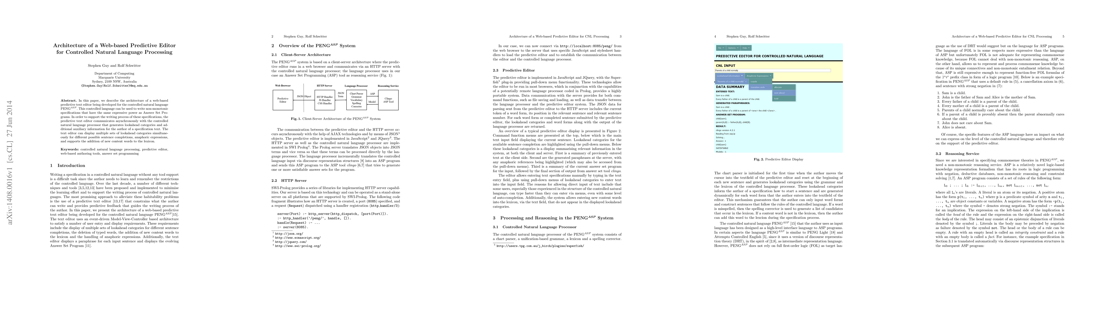 In this paper, we describe the architecture of a web-based predictive text editor being developed for the controlled natural language PENG$^{ASP)$. This controlled language can be used to write non-monotonic specifications that have the same expressive power as Answer Set Programs. In order to support the writing process of these specifications, the predictive text editor communicates asynchronously with the controlled natural language processor that generates lookahead categories and additional auxiliary information for the author of a specification text. The text editor can display multiple sets of lookahead categories simultaneously for different possible sentence completions, anaphoric expressions, and supports the addition of new content words to the lexicon.