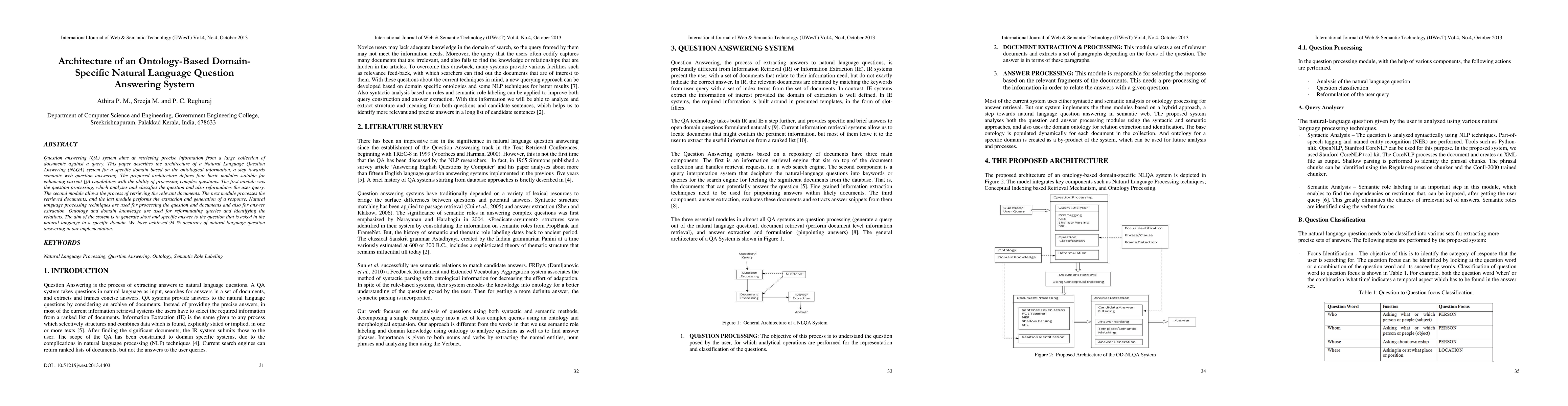 This paper outlines an ontology-based architecture for a domain-specific Natural Language Question Answering (NLQA) system, achieving 94% accuracy. It features four modules: question processing, document retrieval, document processing, and response generation, utilizing NLP and domain knowledge for precise answers.