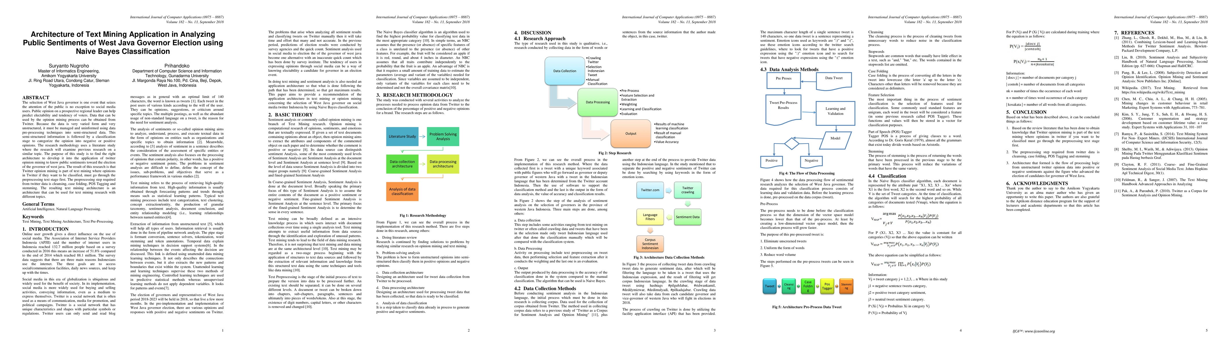 This paper outlines an architecture for text mining applications to analyze public sentiments on Twitter regarding the West Java governor election using Naive Bayes classification. The study emphasizes the importance of data pre-processing techniques to convert unstructured Twitter data into semi-structured information for effective sentiment analysis.