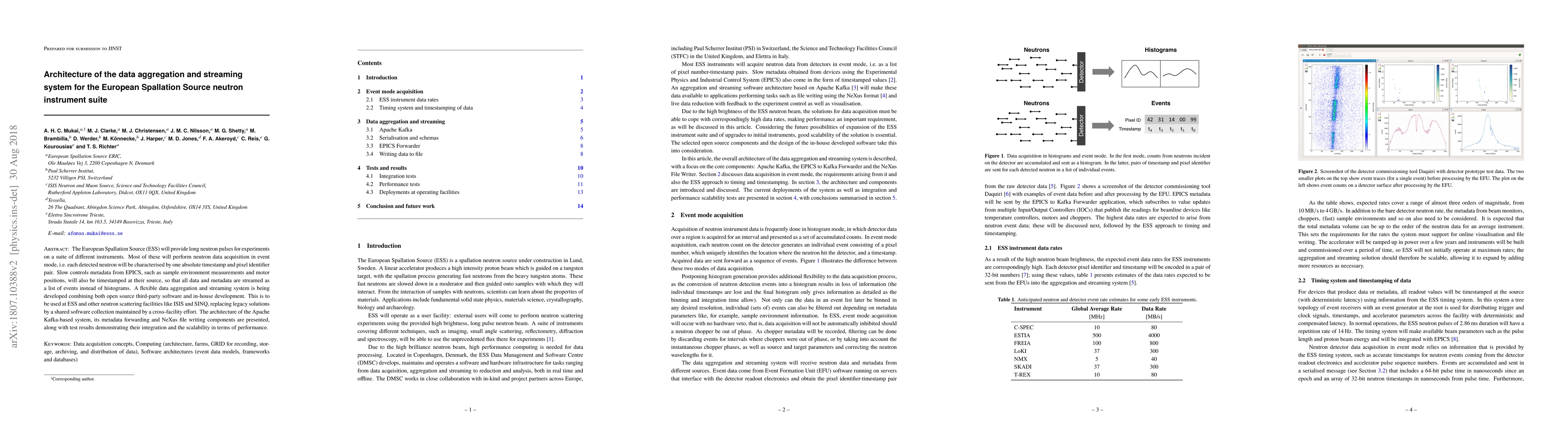 The paper outlines the architecture of a data aggregation and streaming system for the European Spallation Source neutron instrument suite, utilizing Apache Kafka for efficient event-based data streaming and NeXus file writing, and presents test results showcasing its scalability and integration.
