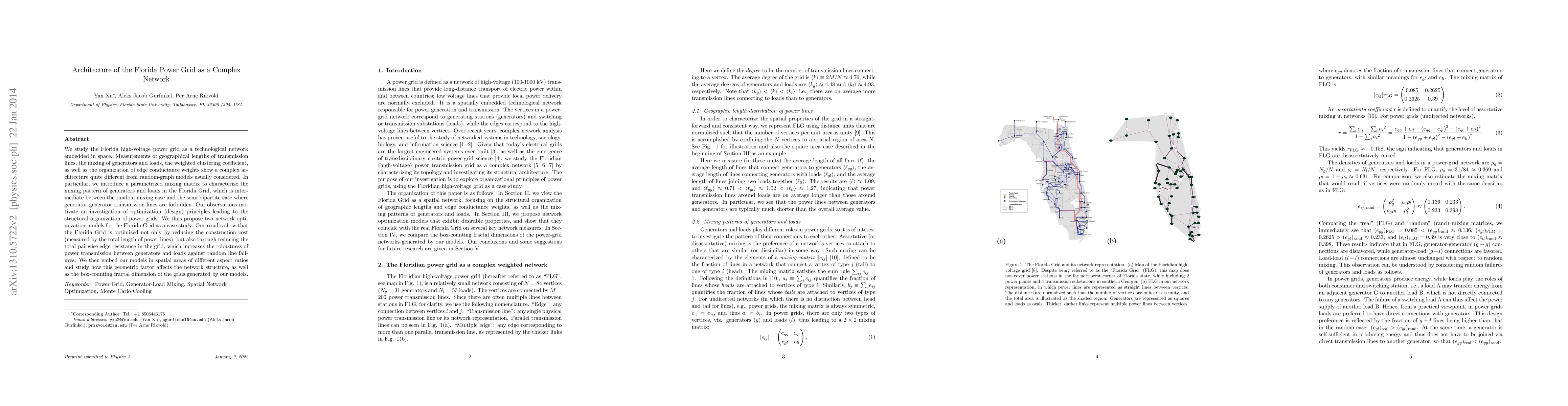 This paper examines the Florida power grid as a complex network, revealing its non-random architecture through spatial measurements and optimization models. It introduces a parametrized mixing matrix to describe the grid's unique organization and proposes optimization models that enhance both construction cost efficiency and transmission robustness.