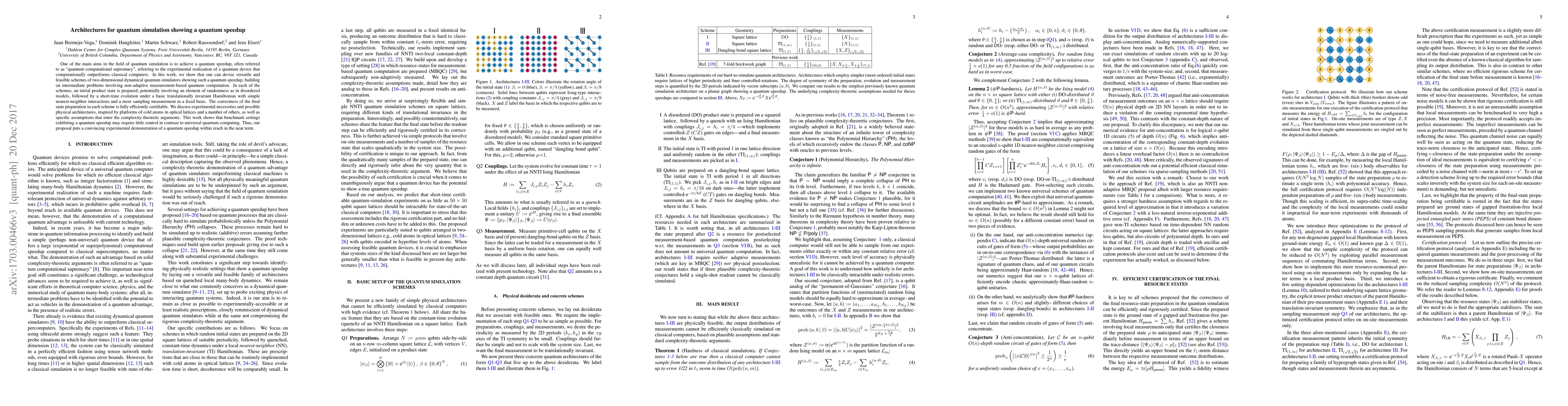 One of the main aims in the field of quantum simulation is to achieve a quantum speedup, often referred to as "quantum computational supremacy", referring to the experimental realization of a quantum device that computationally outperforms classical computers. In this work, we show that one can devise versatile and feasible schemes of two-dimensional dynamical quantum simulators showing such a quantum speedup, building on intermediate problems involving non-adaptive measurement-based quantum computation. In each of the schemes, an initial product state is prepared, potentially involving an element of randomness as in disordered models, followed by a short-time evolution under a basic translationally invariant Hamiltonian with simple nearest-neighbor interactions and a mere sampling measurement in a fixed basis. The correctness of the final state preparation in each scheme is fully efficiently certifiable. We discuss experimental necessities and possible physical architectures, inspired by platforms of cold atoms in optical lattices and a number of others, as well as specific assumptions that enter the complexity-theoretic arguments. This work shows that benchmark settings exhibiting a quantum speedup may require little control in contrast to universal quantum computing. Thus, our proposal puts a convincing experimental demonstration of a quantum speedup within reach in the near term.