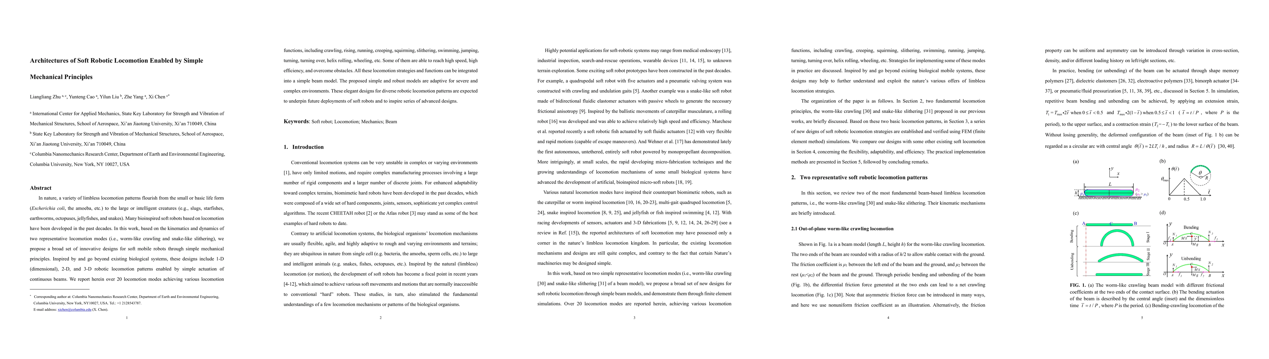 In nature, a variety of limbless locomotion patterns flourish from the small or basic life form (Escherichia coli, the amoeba, etc.) to the large or intelligent creatures (e.g., slugs, starfishes, earthworms, octopuses, jellyfishes, and snakes). Many bioinspired soft robots based on locomotion have been developed in the past decades. In this work, based on the kinematics and dynamics of two representative locomotion modes (i.e., worm-like crawling and snake-like slithering), we propose a broad set of innovative designs for soft mobile robots through simple mechanical principles. Inspired by and go beyond existing biological systems, these designs include 1-D (dimensional), 2-D, and 3-D robotic locomotion patterns enabled by simple actuation of continuous beams. We report herein over 20 locomotion modes achieving various locomotion functions, including crawling, rising, running, creeping, squirming, slithering, swimming, jumping, turning, turning over, helix rolling, wheeling, etc. Some of them are able to reach high speed, high efficiency, and overcome obstacles. All these locomotion strategies and functions can be integrated into a simple beam model. The proposed simple and robust models are adaptive for severe and complex environments. These elegant designs for diverse robotic locomotion patterns are expected to underpin future deployments of soft robots and to inspire series of advanced designs.