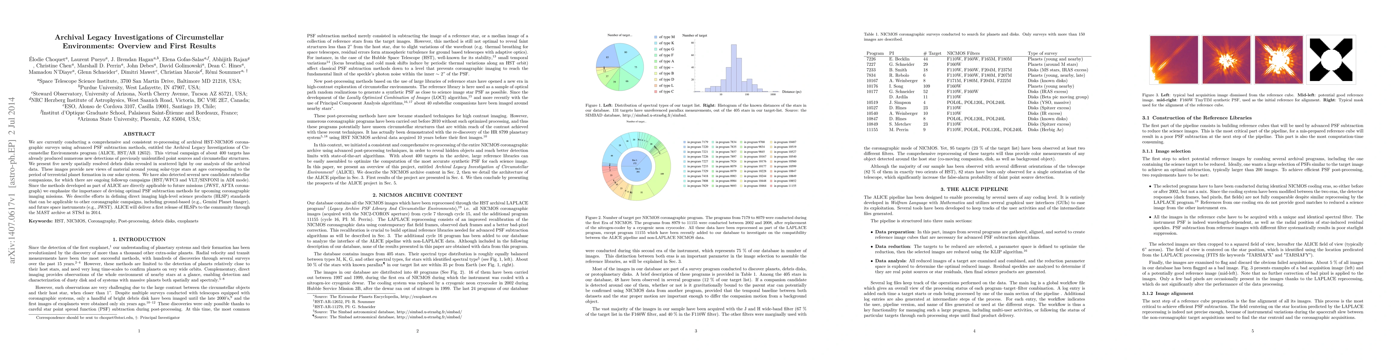 The ALICE program re-processes archival HST-NICMOS data to detect new circumstellar structures and substellar companions, revealing five debris disks and several candidate substellar objects. The study emphasizes the importance of advanced PSF subtraction methods for future coronagraphic missions.