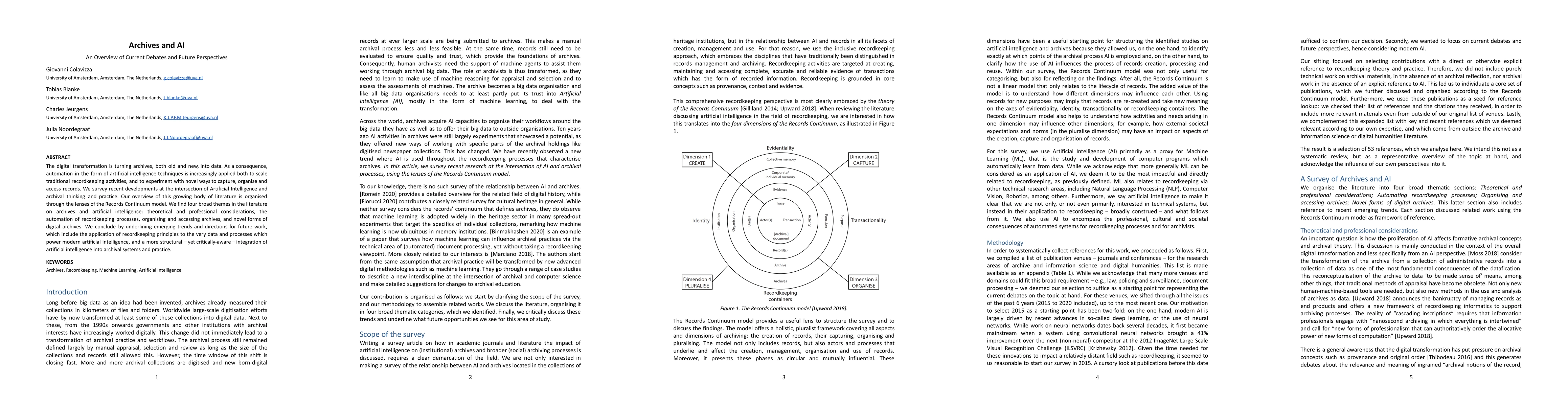 The paper provides an overview of the current debates and future perspectives on the intersection of AI and archival science, organizing the literature through the Records Continuum model.