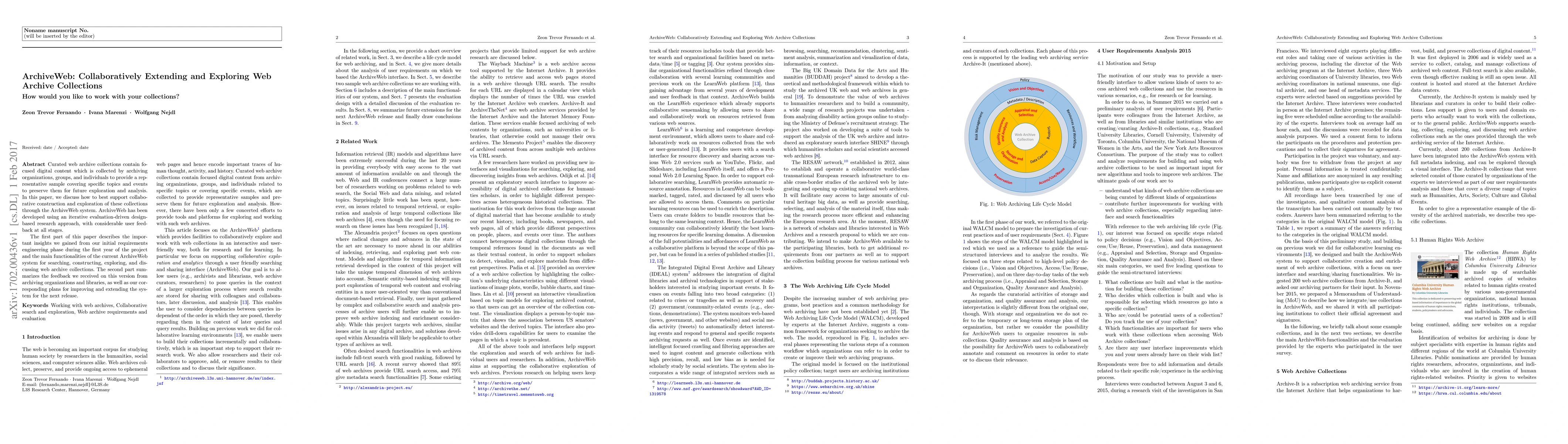 ArchiveWeb facilitates collaborative construction and exploration of curated web archive collections through an iterative design-based research approach. The system's functionalities include searching, constructing, and discussing web archive collections, with plans for enhancements based on user feedback from archiving organizations and libraries.