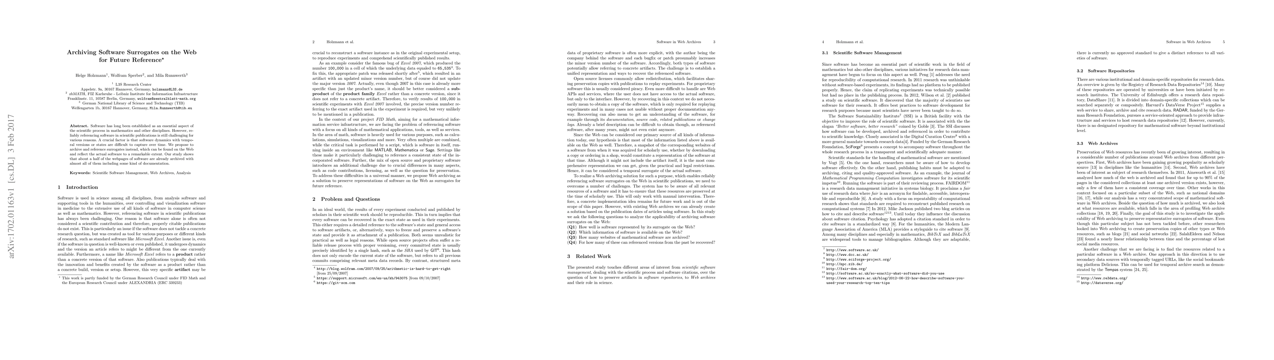 Software has long been established as an essential aspect of the scientific process in mathematics and other disciplines. However, reliably referencing software in scientific publications is still challenging for various reasons. A crucial factor is that software dynamics with temporal versions or states are difficult to capture over time. We propose to archive and reference surrogates instead, which can be found on the Web and reflect the actual software to a remarkable extent. Our study shows that about a half of the webpages of software are already archived with almost all of them including some kind of documentation.