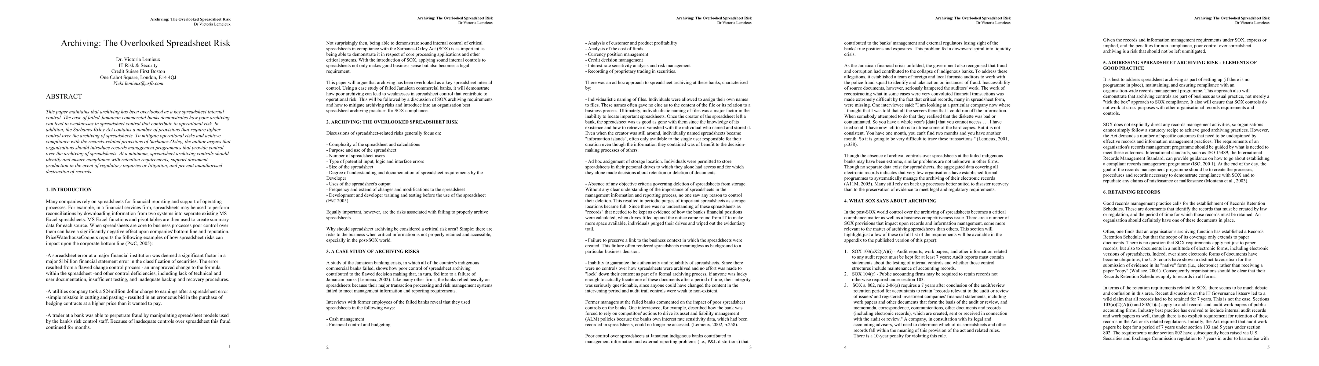 This paper maintains that archiving has been overlooked as a key spreadsheet internal control. The case of failed Jamaican commercial banks demonstrates how poor archiving can lead to weaknesses in spreadsheet control that contribute to operational risk. In addition, the Sarbanes-0xley Act contains a number of provisions that require tighter control over the archiving of spreadsheets. To mitigate operational risks and achieve compliance with the records-related provisions of Sarbanes-Oxley, the author argues that organisations should introduce records management programmes that provide control over the archiving of spreadsheets. At a minimum, spreadsheet archiving controls should identify and ensure compliance with retention requirements, support document production in the event of regulatory inquiries or litigation, and prevent unauthorised destruction of records.