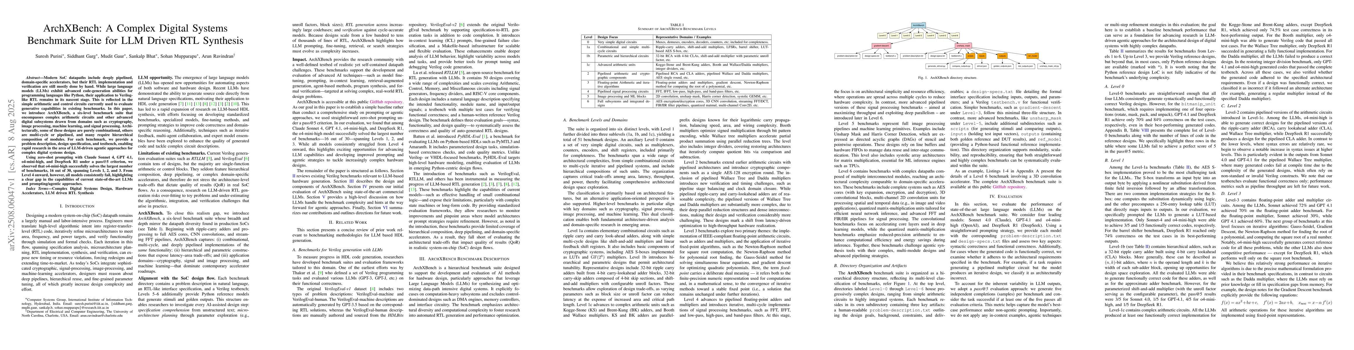 Modern SoC datapaths include deeply pipelined, domain-specific accelerators, but their RTL implementation and verification are still mostly done by hand. While large language models (LLMs) exhibit advanced code-generation abilities for programming languages like Python, their application to Verilog-like RTL remains in its nascent stage. This is reflected in the simple arithmetic and control circuits currently used to evaluate generative capabilities in existing benchmarks. In this paper, we introduce ArchXBench, a six-level benchmark suite that encompasses complex arithmetic circuits and other advanced digital subsystems drawn from domains such as cryptography, image processing, machine learning, and signal processing. Architecturally, some of these designs are purely combinational, others are multi-cycle or pipelined, and many require hierarchical composition of modules. For each benchmark, we provide a problem description, design specification, and testbench, enabling rapid research in the area of LLM-driven agentic approaches for complex digital systems design. Using zero-shot prompting with Claude Sonnet 4, GPT 4.1, o4-mini-high, and DeepSeek R1 under a pass@5 criterion, we observed that o4-mini-high successfully solves the largest number of benchmarks, 16 out of 30, spanning Levels 1, 2, and 3. From Level 4 onward, however, all models consistently fail, highlighting a clear gap in the capabilities of current state-of-the-art LLMs and prompting/agentic approaches.