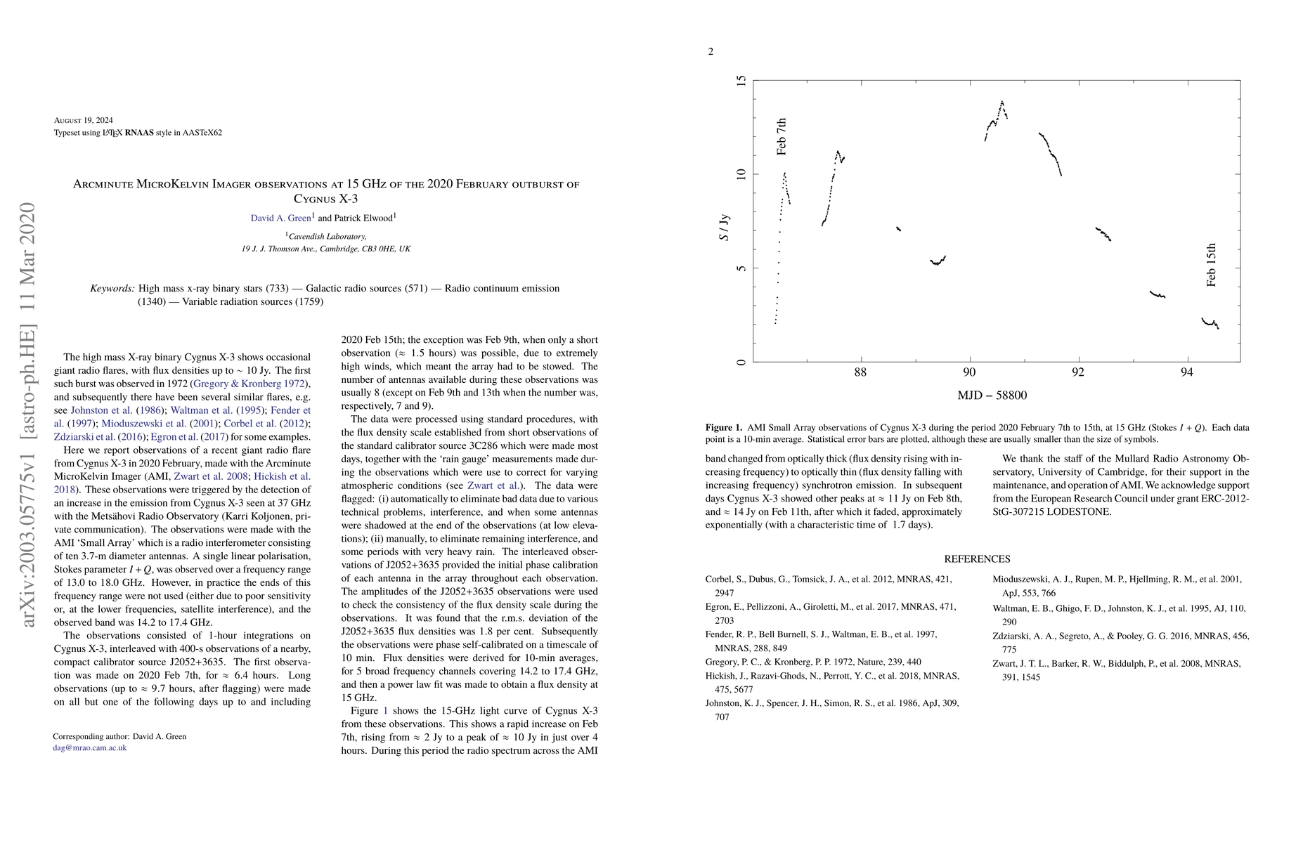 Here we report observations of a recent giant radio flare from Cygnus X-3 in 2020 February, made with the Arcminute MicroKelvin Imager.