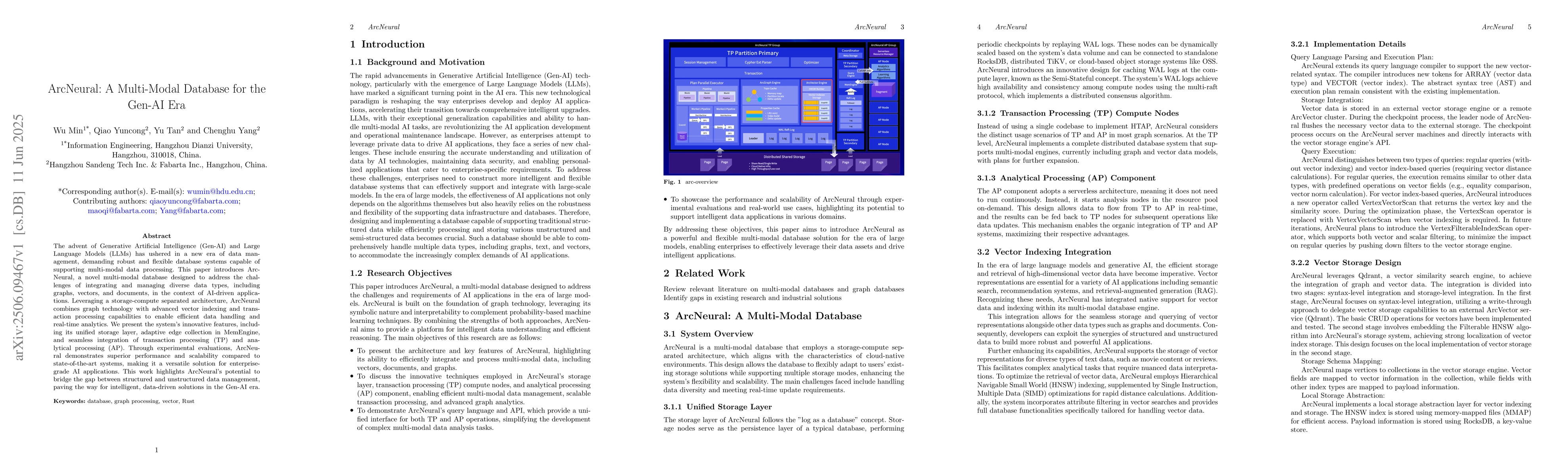 ArcNeural introduces a novel multimodal database tailored for the demands of Generative AI and Large Language Models, enabling efficient management of diverse data types such as graphs, vectors, and documents. Its storage-compute separated architecture integrates graph technology, advanced vector indexing, and transaction processing to support real-time analytics and AI-driven applications. Key features include a unified storage layer, adaptive edge collection in MemEngine, and seamless integration of transaction and analytical processing. Experimental evaluations demonstrate ArcNeural's superior performance and scalability compared to state-of-the-art systems. This system bridges structured and unstructured data management, offering a versatile solution for enterprise-grade AI applications. ArcNeural's design addresses the challenges of multimodal data processing, providing a robust framework for intelligent, data-driven solutions in the Gen AI era.