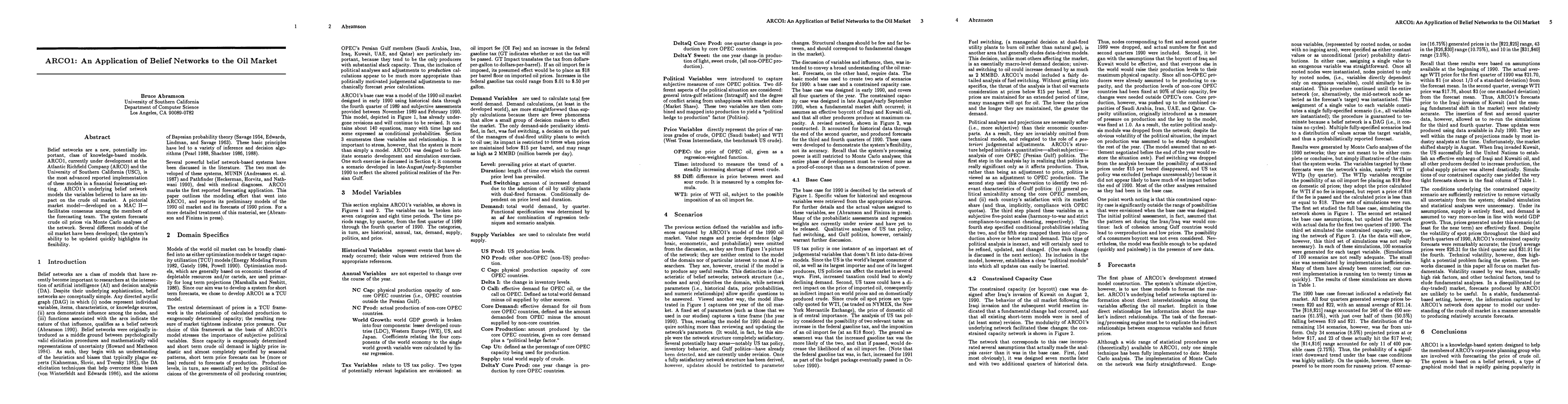 Belief networks are a new, potentially important, class of knowledge-based models. ARCO1, currently under development at the Atlantic Richfield Company (ARCO) and the University of Southern California (USC), is the most advanced reported implementation of these models in a financial forecasting setting. ARCO1's underlying belief network models the variables believed to have an impact on the crude oil market. A pictorial market model-developed on a MAC II- facilitates consensus among the members of the forecasting team. The system forecasts crude oil prices via Monte Carlo analyses of the network. Several different models of the oil market have been developed; the system's ability to be updated quickly highlights its flexibility.