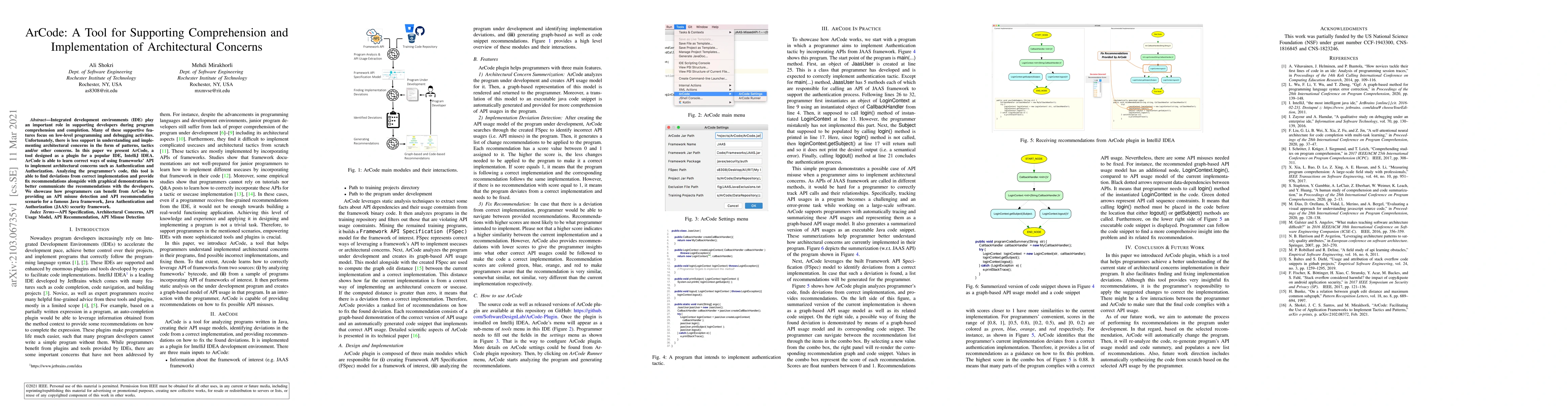 Integrated development environments (IDE) play an important role in supporting developers during program comprehension and completion. Many of these supportive features focus on low-level programming and debugging activities. Unfortunately, there is less support in understanding and implementing architectural concerns in the form of patterns, tactics and/or other concerns. In this paper we present ArCode, a tool designed as a plugin for a popular IDE, IntelliJ IDEA. ArCode is able to learn correct ways of using frameworks' API to implement architectural concerns such as Authentication and Authorization. Analyzing the programmer's code, this tool is able to find deviations from correct implementation and provide fix recommendations alongside with graphical demonstrations to better communicate the recommendations with the developers. We showcase how programmers can benefit from ArCode by providing an API misuse detection and API recommendation scenario for a famous Java framework, Java Authentication and Authorization (JAAS) security framework.
