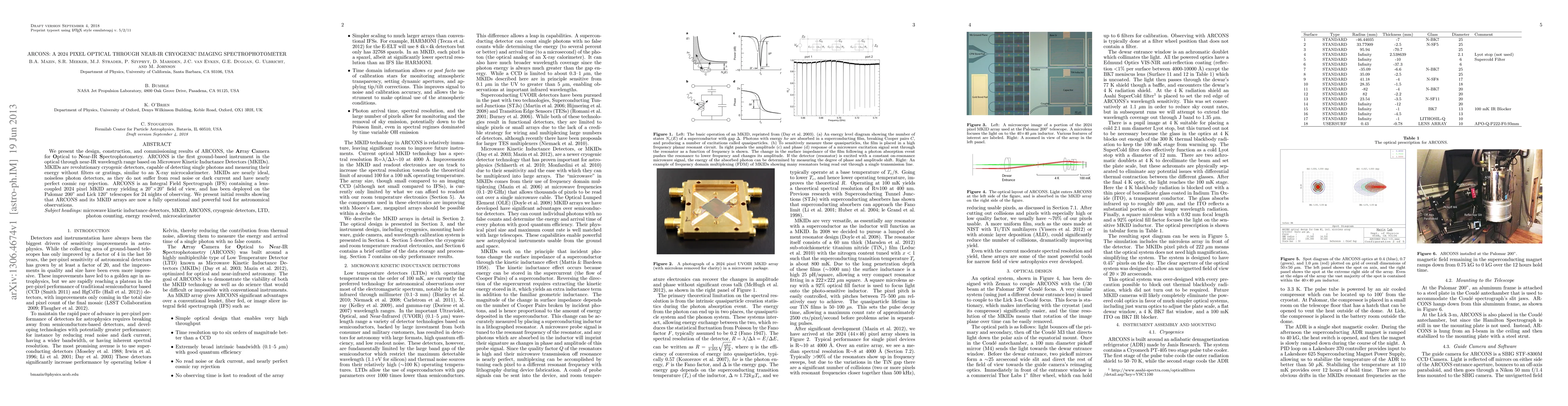 ARCONS is a groundbreaking cryogenic imaging spectrometer using Microwave Kinetic Inductance Detectors (MKIDs) for optical to near-IR wavelengths, demonstrating near-perfect photon detection capabilities and deployed on Palomar and Lick telescopes. Initial observations confirm its operational success as a powerful tool for astronomical research.