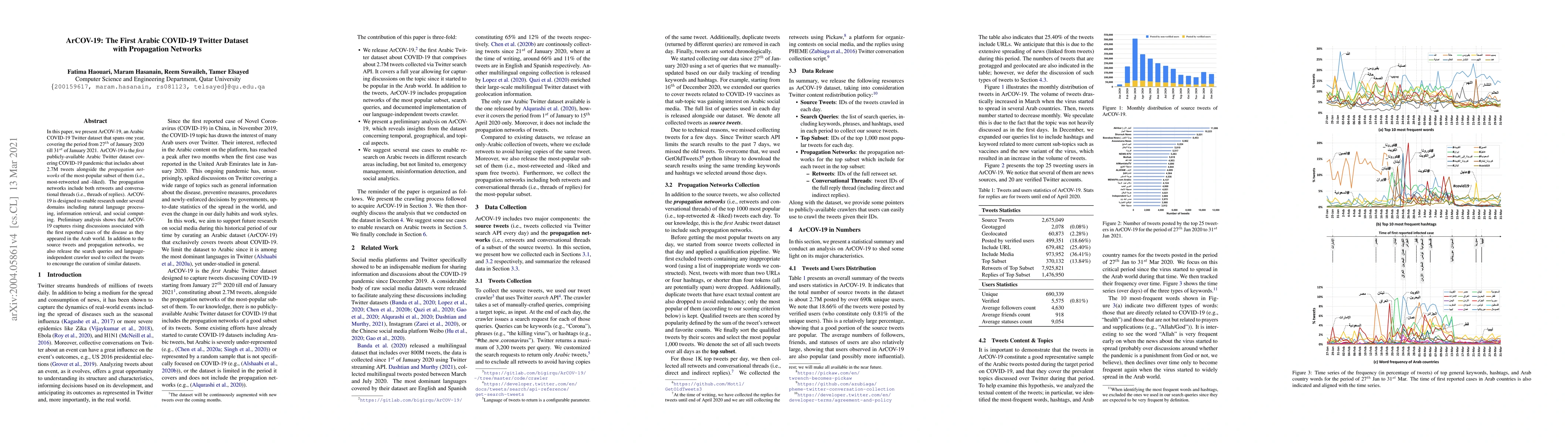ArCOV-19 is the first publicly available Arabic COVID-19 Twitter dataset, covering 2.7M tweets from January 2020 to January 2021, along with propagation networks of retweets and reply threads. It aims to facilitate research in natural language processing, information retrieval, and social computing.