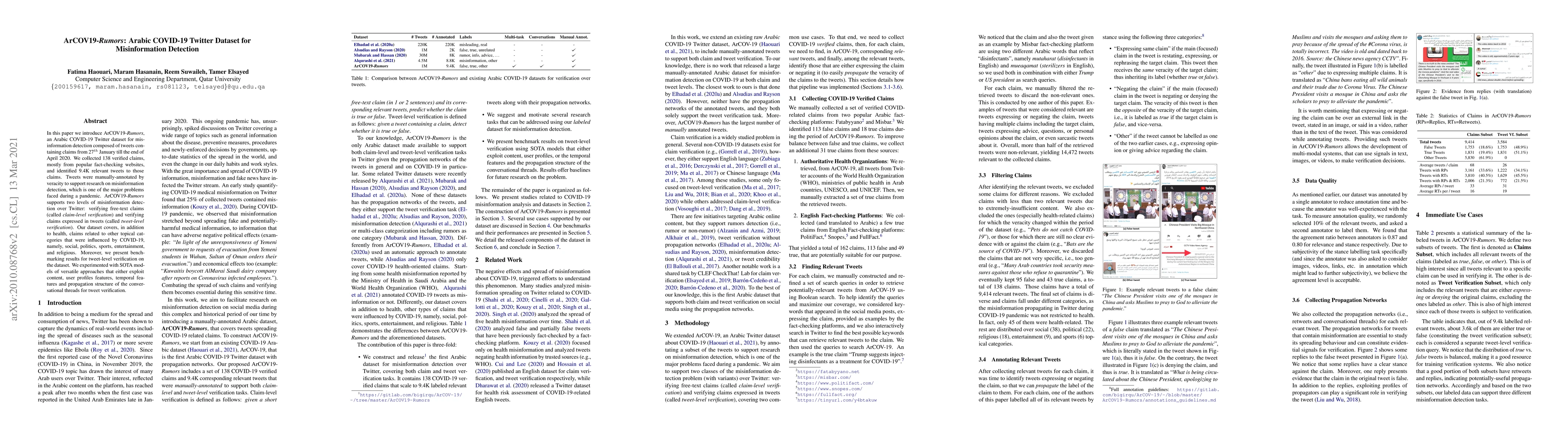 This paper introduces ArCOV19-Rumors, an Arabic COVID-19 Twitter dataset for misinformation detection, containing verified claims and relevant tweets annotated for veracity. The dataset supports claim-level and tweet-level verification across various topics, and benchmarking results show the effectiveness of state-of-the-art models for tweet verification.