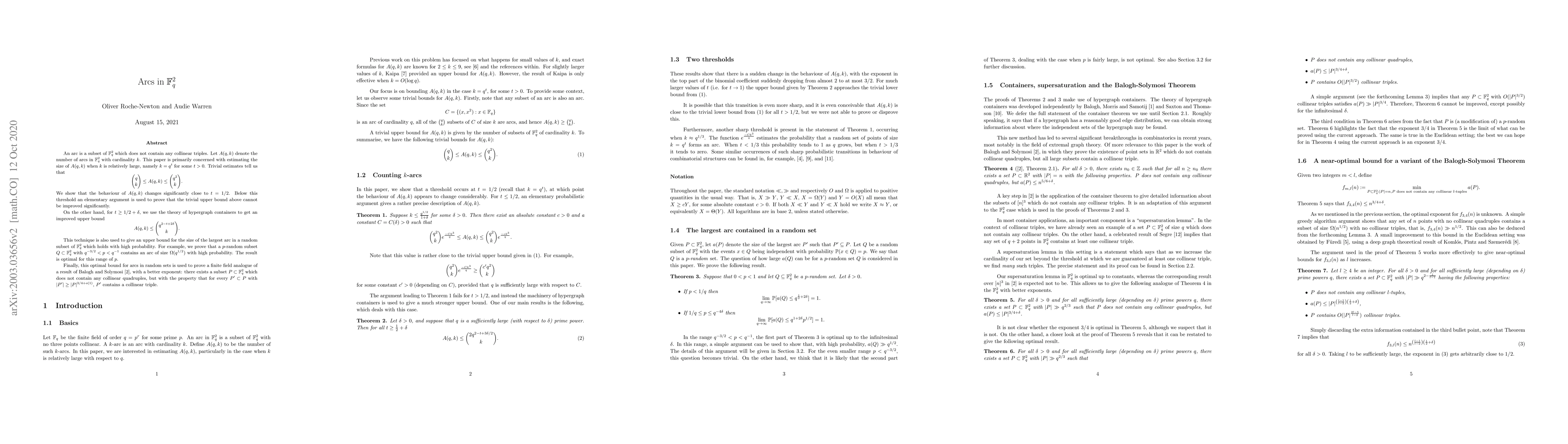 This paper estimates the size of arcs in $\mathbb F_q^2$ that do not contain any collinear triples, showing that for large $k=q^t$, the behavior of $A(q,k)$ changes significantly near $t=1/2$. For $t \geq 1/2+\delta$, it provides an improved upper bound using hypergraph container theory and proves optimal bounds for arcs in random subsets of $\mathbb F_q^2$.