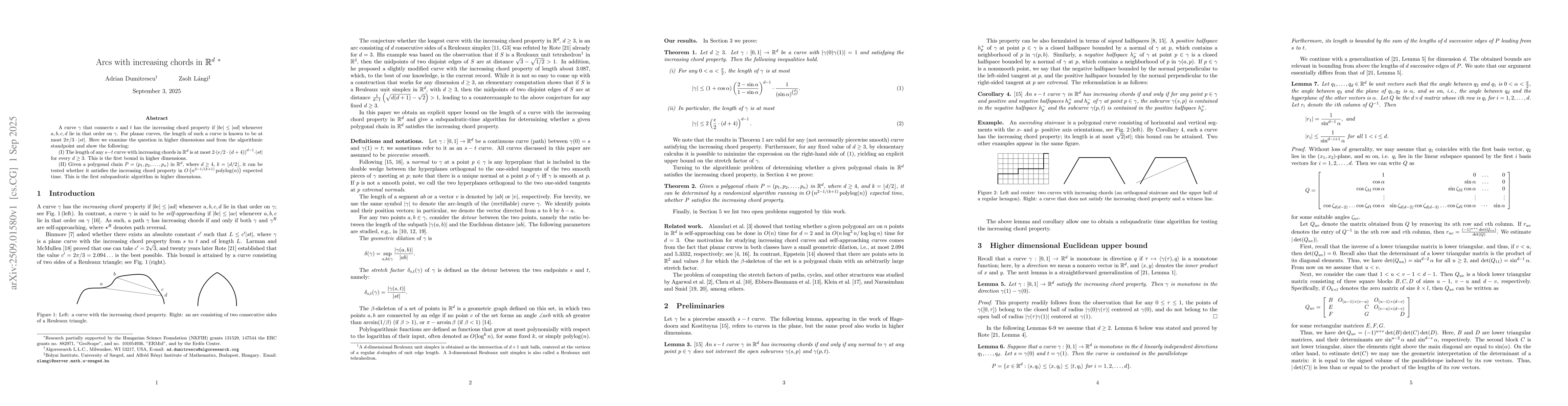 A curve $\gamma$ that connects $s$ and $t$ has the increasing chord property if $|bc| \leq |ad|$ whenever $a,b,c,d$ lie in that order on $\gamma$. For planar curves, the length of such a curve is known to be at most $2\pi/3 \cdot |st|$. Here we examine the question in higher dimensions and from the algorithmic standpoint and show the following: (I) The length of any $s-t$ curve with increasing chords in $\mathbf{R}^d$ is at most $2 \cdot \left( e/2 \cdot (d+4) \right)^{d-1} \cdot |st|$ for every $d \geq 3$. This is the first bound in higher dimensions. (II) Given a polygonal chain $P=(p_1, p_2, \dots, p_n)$ in $\mathbf{R}^d$, where $d \geq 4$, $k =\lfloor d/2 \rfloor$, it can be tested whether it satisfies the increasing chord property in $O\left(n^{2-1/(k+1)} {\rm polylog} (n) \right)$ expected time. This is the first subquadratic algorithm in higher dimensions.