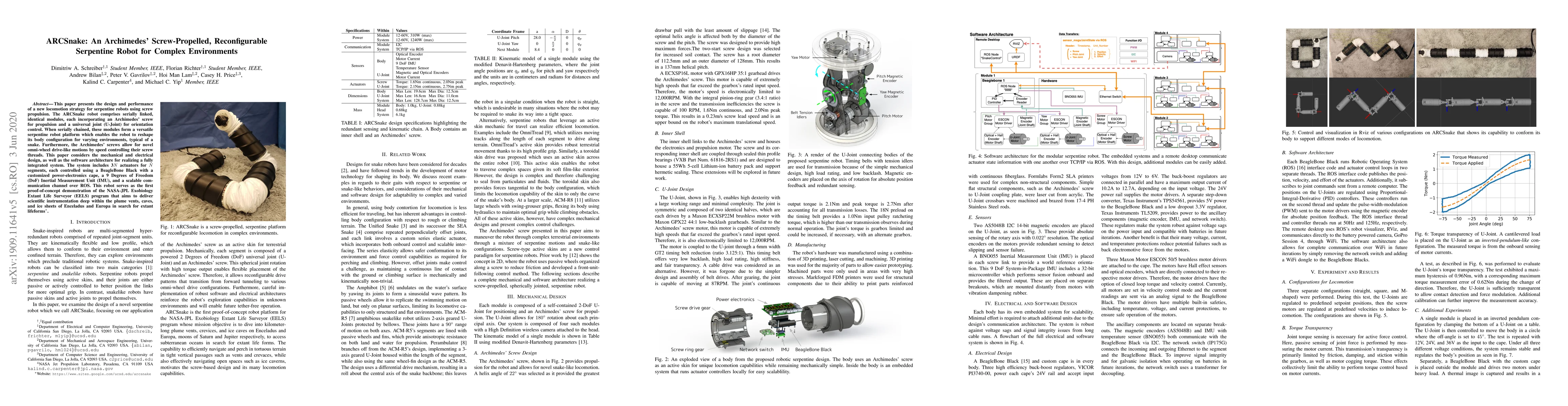 This paper introduces ARCSnake, a reconfigurable robot snake utilizing Archimedes' screws for propulsion and universal joints for orientation control, designed for complex terrains. The robot features modular segments and an integrated system with scalable communication and control for potential use on extraterrestrial exploration.