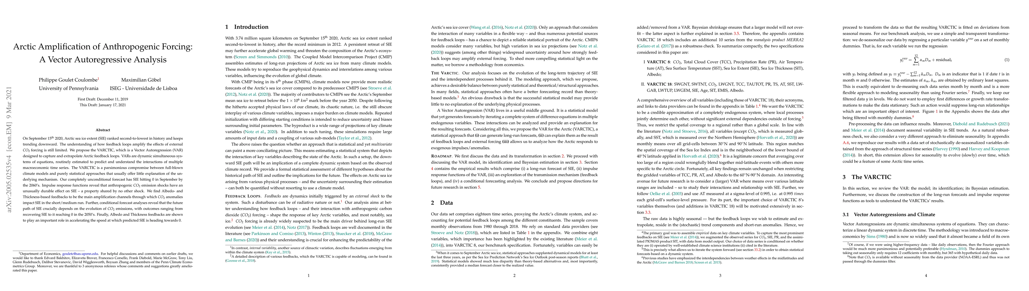 This paper uses a Vector Autoregression (VAR) model, named VARCTIC, to analyze Arctic feedback loops amplifying anthropogenic CO2 forcing. The model predicts Arctic sea ice extent (SIE) could reach zero by the 2060s, with CO2 emissions shocks having a lasting impact on SIE, driven primarily by Albedo and Thickness feedbacks.