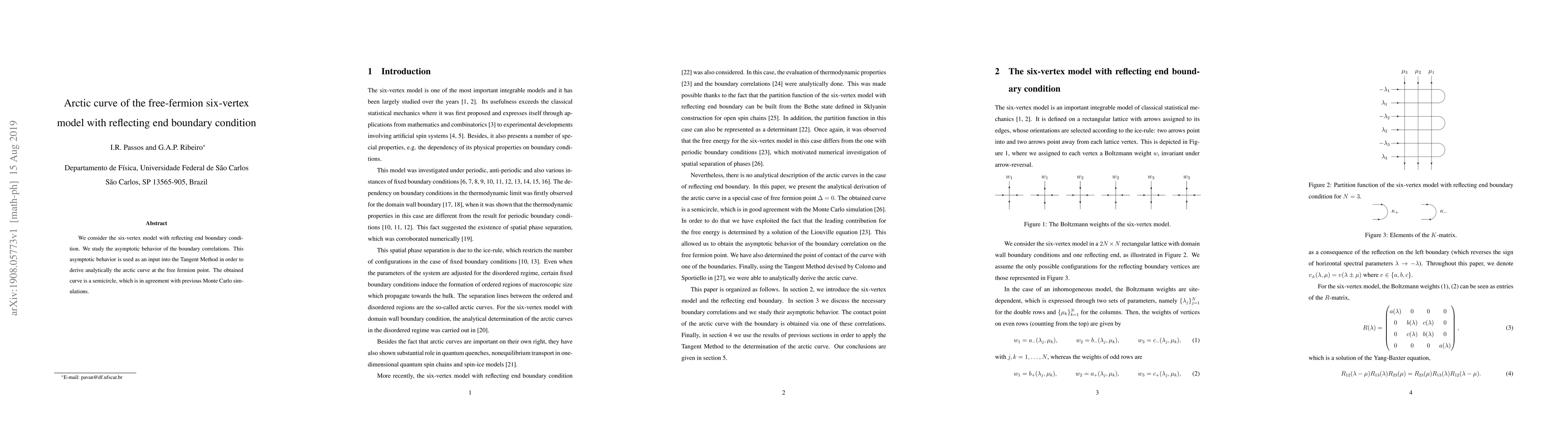We consider the six-vertex model with reflecting end boundary condition. We study the asymptotic behavior of the boundary correlations. This asymptotic behavior is used as an input into the Tangent Method in order to derive analytically the arctic curve at the free fermion point. The obtained curve is a semicircle, which is in agreement with previous Monte Carlo simulations.