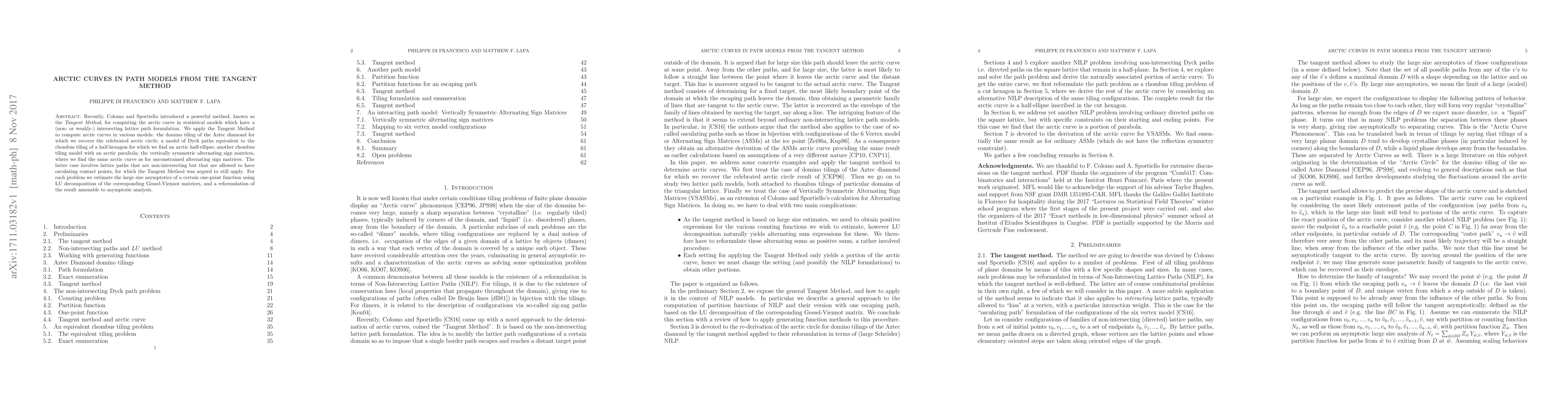 This paper applies the Tangent Method to compute arctic curves in various lattice path models, including domino tilings, Dyck paths, and alternating sign matrices, finding shapes like circles, ellipses, and parabolas. It uses LU decomposition and Gessel-Viennot matrices to estimate large size asymptotics of one-point functions.