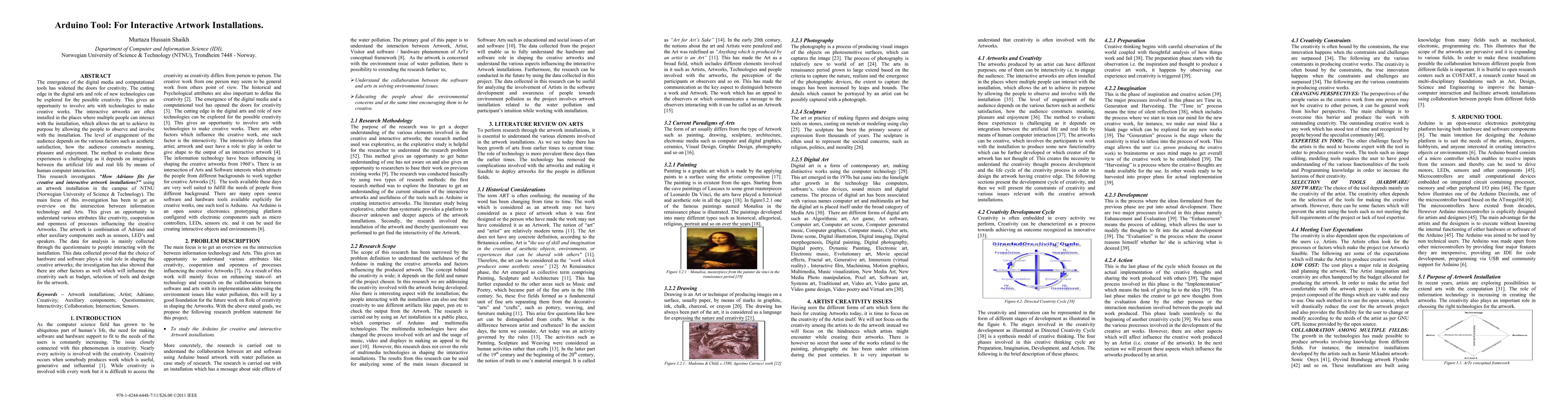 The emergence of the digital media and computational tools has widened the doors for creativity. The cutting edge in the digital arts and role of new technologies can be explored for the possible creativity. This gives an opportunity to involve arts with technologies to make creative works. The interactive artworks are often installed in the places where multiple people can interact with the installation, which allows the art to achieve its purpose by allowing the people to observe and involve with the installation. The level of engagement of the audience depends on the various factors such as aesthetic satisfaction, how the audience constructs meaning, pleasure and enjoyment. The method to evaluate these experiences is challenging as it depends on integration between the artificial life and real life by means of human computer interaction. This research investigates "How Adriano fits for creative and interactive artwork installations?" using an artwork installation in the campus of NTNU (Norwegian University of Science & Technology). The main focus of this investigation has been to get an overview on the intersection between information technology and Arts. This gives an opportunity to understand various attributes like creativity, cooperation and openness of processes influencing the creative Artworks. The artwork is combination of Adriano and other auxiliary components such as sensors, LED's and speakers.
