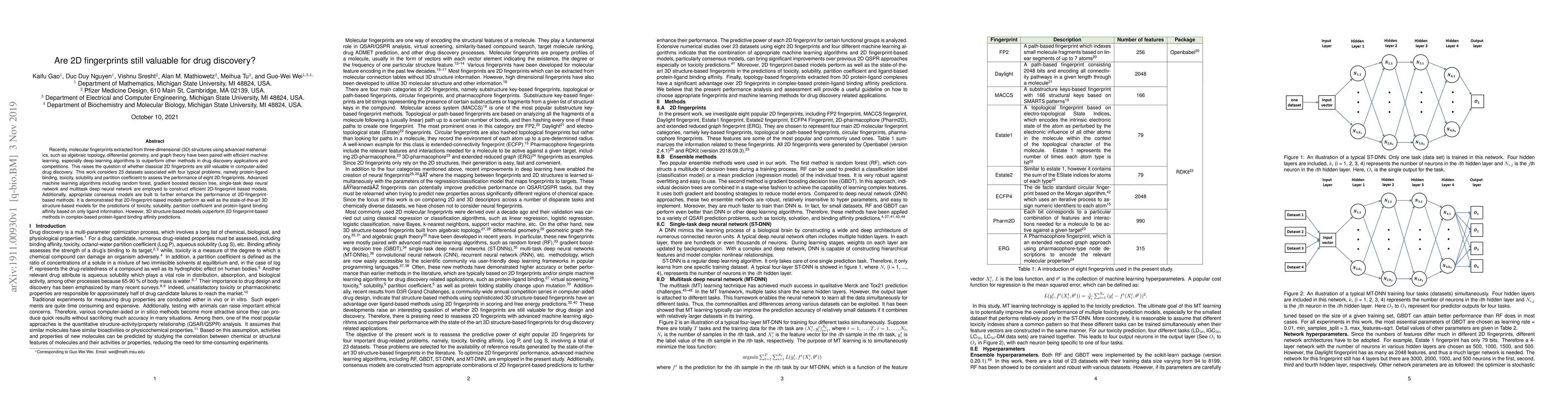 Recently, molecular fingerprints extracted from three-dimensional (3D) structures using advanced mathematics, such as algebraic topology, differential geometry, and graph theory have been paired with efficient machine learning, especially deep learning algorithms to outperform other methods in drug discovery applications and competitions. This raises the question of whether classical 2D fingerprints are still valuable in computer-aided drug discovery. This work considers 23 datasets associated with four typical problems, namely protein-ligand binding, toxicity, solubility and partition coefficient to assess the performance of eight 2D fingerprints. Advanced machine learning algorithms including random forest, gradient boosted decision tree, single-task deep neural network and multitask deep neural network are employed to construct efficient 2D-fingerprint based models. Additionally, appropriate consensus models are built to further enhance the performance of 2D-fingerprintbased methods. It is demonstrated that 2D-fingerprint-based models perform as well as the state-of-the-art 3D structure-based models for the predictions of toxicity, solubility, partition coefficient and protein-ligand binding affinity based on only ligand information. However, 3D structure-based models outperform 2D fingerprint-based methods in complex-based protein-ligand binding affinity predictions.