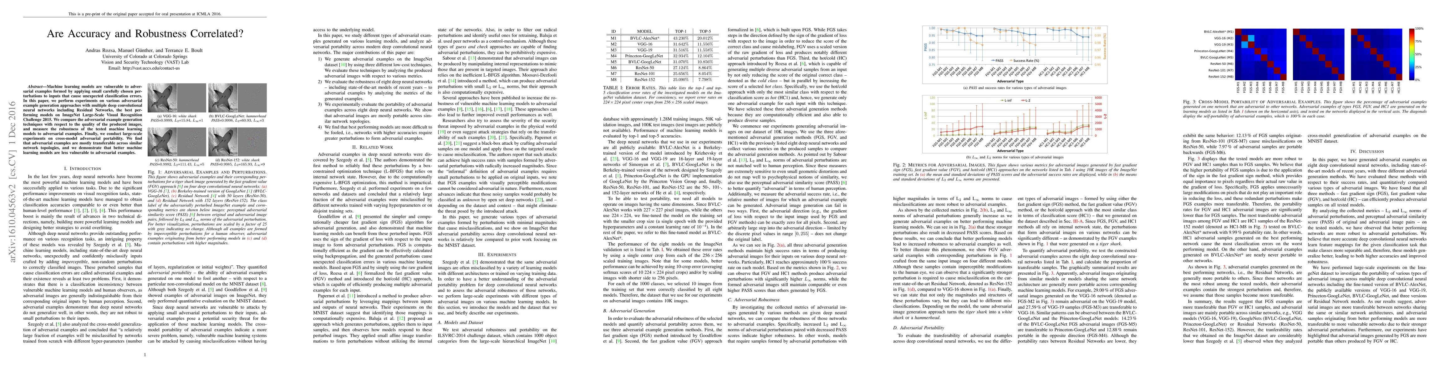 Machine learning models are vulnerable to adversarial examples formed by applying small carefully chosen perturbations to inputs that cause unexpected classification errors. In this paper, we perform experiments on various adversarial example generation approaches with multiple deep convolutional neural networks including Residual Networks, the best performing models on ImageNet Large-Scale Visual Recognition Challenge 2015. We compare the adversarial example generation techniques with respect to the quality of the produced images, and measure the robustness of the tested machine learning models to adversarial examples. Finally, we conduct large-scale experiments on cross-model adversarial portability. We find that adversarial examples are mostly transferable across similar network topologies, and we demonstrate that better machine learning models are less vulnerable to adversarial examples.