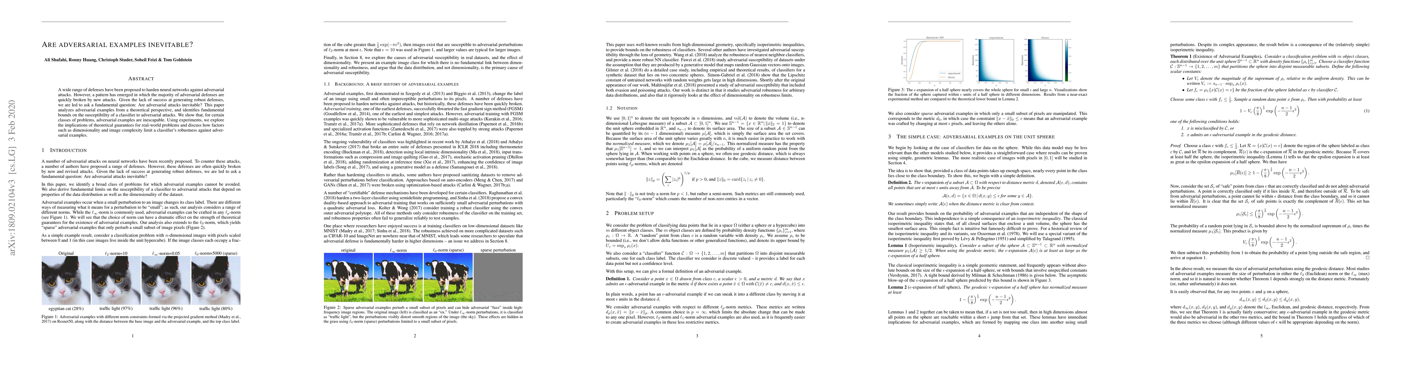 A wide range of defenses have been proposed to harden neural networks against adversarial attacks. However, a pattern has emerged in which the majority of adversarial defenses are quickly broken by new attacks. Given the lack of success at generating robust defenses, we are led to ask a fundamental question: Are adversarial attacks inevitable? This paper analyzes adversarial examples from a theoretical perspective, and identifies fundamental bounds on the susceptibility of a classifier to adversarial attacks. We show that, for certain classes of problems, adversarial examples are inescapable. Using experiments, we explore the implications of theoretical guarantees for real-world problems and discuss how factors such as dimensionality and image complexity limit a classifier's robustness against adversarial examples.