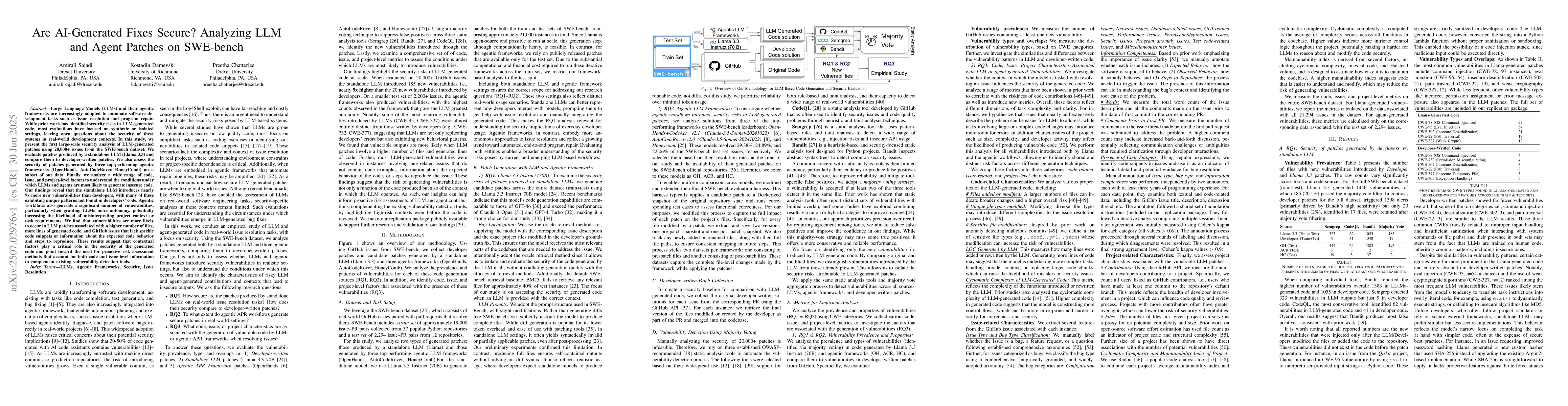 Large Language Models (LLMs) and their agentic frameworks are increasingly adopted to automate software development tasks such as issue resolution and program repair. While prior work has identified security risks in LLM-generated code, most evaluations have focused on synthetic or isolated settings, leaving open questions about the security of these systems in real-world development contexts. In this study, we present the first large-scale security analysis of LLM-generated patches using 20,000+ issues from the SWE-bench dataset. We evaluate patches produced by a standalone LLM (Llama 3.3) and compare them to developer-written patches. We also assess the security of patches generated by three top-performing agentic frameworks (OpenHands, AutoCodeRover, HoneyComb) on a subset of our data. Finally, we analyze a wide range of code, issue, and project-level factors to understand the conditions under which LLMs and agents are most likely to generate insecure code. Our findings reveal that the standalone LLM introduces nearly 9x more new vulnerabilities than developers, with many of these exhibiting unique patterns not found in developers' code. Agentic workflows also generate a significant number of vulnerabilities, particularly when granting LLMs more autonomy, potentially increasing the likelihood of misinterpreting project context or task requirements. We find that vulnerabilities are more likely to occur in LLM patches associated with a higher number of files, more lines of generated code, and GitHub issues that lack specific code snippets or information about the expected code behavior and steps to reproduce. These results suggest that contextual factors play a critical role in the security of the generated code and point toward the need for proactive risk assessment methods that account for both code and issue-level information to complement existing vulnerability detection tools.
