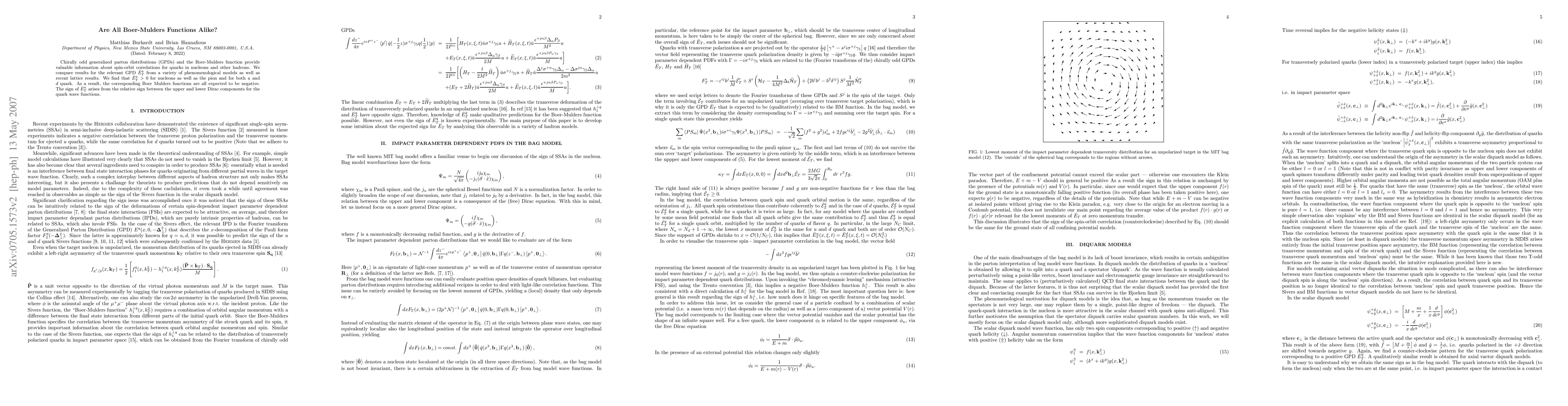 Chirally odd generalized parton distributions (GPDs) and the Boer-Mulders function provide valuable information about spin-orbit correlations for quarks in nucleons and other hadrons. We compare results for the relevant GPD $\bar{E}^q_T$ from a variety of phenomenological models as well as recent lattice results. We find that $\bar{E}^q_T>0$ for nucleons as well as the pion and for both $u$ and $d$ quark. As a result, the corresponding Boer Mulders functions are all expected to be negative. The sign of $\bar{E}^q_T$ arises from the relative sign between the upper and lower Dirac components for the quark wave functions.