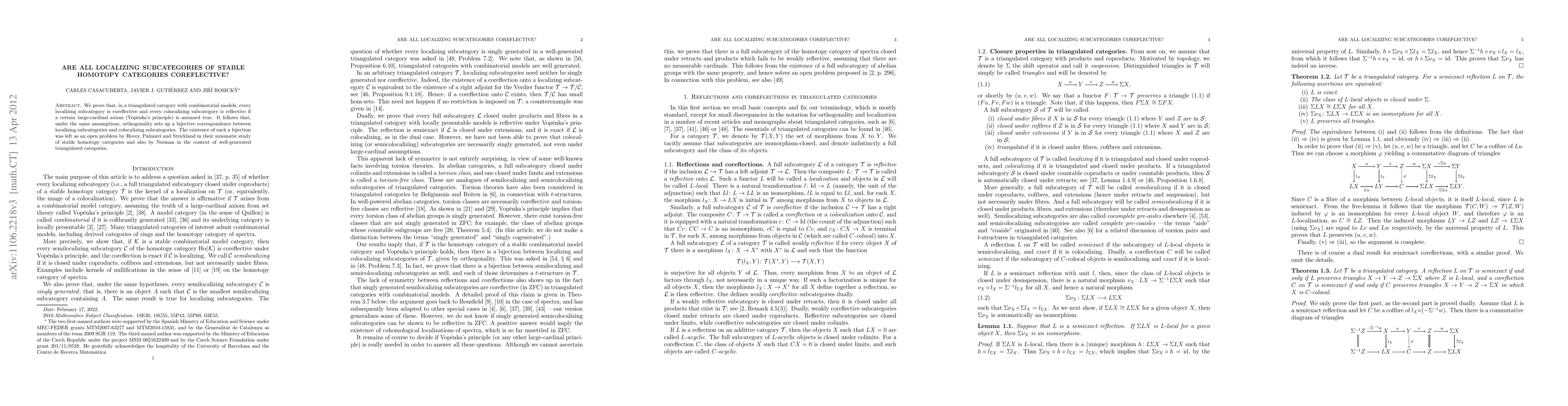 This paper proves that, under Vopenka's principle, all localizing subcategories in triangulated categories with combinatorial models are coreflective, resolving an open question from Hovey, Palmieri, Strickland, and Neeman regarding the bijection between localizing and colocalizing subcategories.